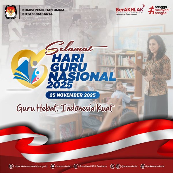 Hai #temanpemilih Keluarga Besar KPU Kota Surakarta Mengucapkan Selamat Hari Guru Nasional, 25 November 2025. Terimakasih atas dedikasi dan ketulusan yang selalu menyertai setiap langkahmu. “Guru Hebat, Indonesia Kuat”. #KPUMelayani #kpusurakarta #kpusolo #kotasurakarta #kotasolo