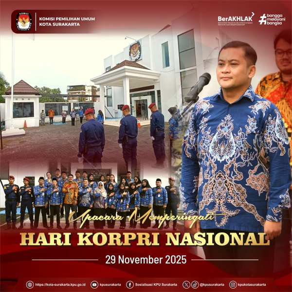 Surakarta, kota-surakarta.kpu.go.id - Ketua Komisi Pemilihan Umum (KPU) Kota Surakarta, Yustinus Arya Artheswara, bertindak sebagai Inspektur Upacara Peringatan Hari Korps Pegawai Republik Indonesia (KORPRI) Tahun 2025 yang digelar di Halaman Kantor KPU Kota Surakarta, Senin (01/12/2025). Upacara ini dihadiri oleh Anggota KPU Kota Surakarta, Plt.Sekretaris KPU Kota Surakarta beserta Jajarannya, Upacara dimulai pada pukul 07.30 WIB. Peringatan Hari Pahlawan Tahun 2025 ini mengusung tema “Bersatu, Berdaulat, Bersama KORPRI Dalam Mewujudkan Indonesia Maju”. (Ed:Asa/kpusurakarta) ....