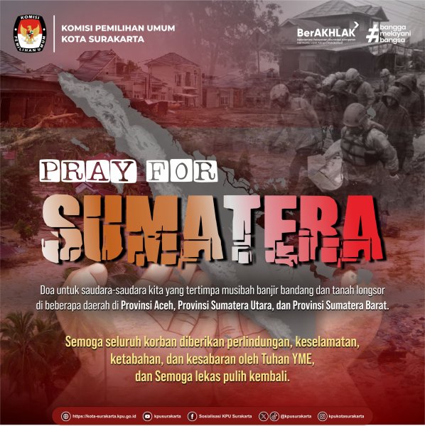 Surakarta, kota-surakarta.kpu.go.id - KPU Kota Surakarta turut berduka cita dan berbela sungkawa atas musibah bencana alam yang terjadi di beberapa daerah di wilayah Provinsi Aceh, Provinsi Sumatera Utara, dan Provinsi Sumatera Barat. Semoga seluruh korban diberikan perlindungan dan keselamatan oleh Tuhan YME, dan untuk wilayah yang terdampak dapat segera pulih kembali. (Ed:Asa/kpusurakarta) ....