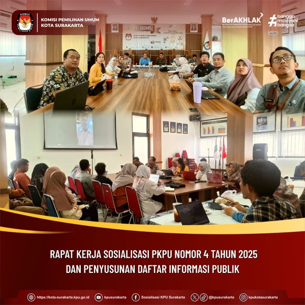 Surakarta, kota-surakarta.kpu.go.id - KPU Kota Surakarta mengikuti kegiatan Rapat Kerja Sosialisasi PKPU 4 Tahun 2025 dan Penyusunan Daftar Informasi Publik yang dilaksanakan oleh KPU Provinsi Jawa Tengah secara Daring. Kegiatan ini mengundang Ketua dan Anggota KPU, Sekretaris, Jajaran Struktural serta Petugas PPID KPU Kabupaten/Kota se Jawa Tengah. Kamis (29/01/2026) Kegiatan ini diikuti oleh Ketua KPU Kota Surakarta, Yustinus Arya Artheswara, beserta seluruh jajaran Sekretariat KPU Kota Surakarta di Aula Kantor KPU Kota Surakarta. Kegiatan dimulai pada pukul 09.30 WIB. Kegiatan dibuka oleh Basmar Periyanto Amron selaku Ketua Divisi Perencanaan dan Logistik KPU Provinsi Jawa Tengah, mewakili ketua KPU Provinsi Jawa Tengah. Tujuan kegiatan ini adalah perdalam pemahaman kita tentang PKPU Nomor 4 Tahun 2025, yang mana PKPU ini merupakan pedoman bagi kita sebagai lembaga yang mengelola dan memberikan pelayanan Informasi Publik. Sebagai lembaga publik kita harus lebih dalam memahami tentang pengelolaan informasi publik. Narasumber yang hadir dalam kegiatan ini adalah Mantan Anggota Komisi Informasi Daerah Istimewa Yogyakarta, dan saat ini menjabat sebagai Ketua Divisi Sosialisasi Pendidikan Pemilih, Partisipasi Masyarakat dan SDM Sri Surani, S.P. Saat ini menjadi waktu yang tidak menguntungkan bagi KPU, namun ini merupakan pengalaman dan dorongan untuk KPU merapikan informasi public. Tantangan kedepan, akan semakin banyak masyarakat meminta informasi public pada lembaga kita, hal ini karena kesadaran masyarakat lebih meningkat pada memahami Undang – Undang 14 Tahun 2008. Rumusan reward dan punishment pelayanan public juga sangat diperlukan. SOP yang menjadi produk KPU harus lebih dirapikan dan disusun dengan baik. Dokumen harus dikuasi oleh masing-masing bagian yang akan menjadi informasi publik. Kegiatan dilengkapi dengan arahan dari Divisi Sosdiklih Parhumas KPU Provinsi Jawa Tengah, Akhmaliyah. Melakukan updating informasi yang wajib dilakukan pada website KPU Kabupaten/Kota. KPU RI telah menerbitkan PKPU 4 Tahun 2025, walau belum ada juknisnya, ada beberapa isi yang dihapus, terkait dengan penyusunan Daftar Informasi Publik. (Ed:Asa/kpusurakarta) ....