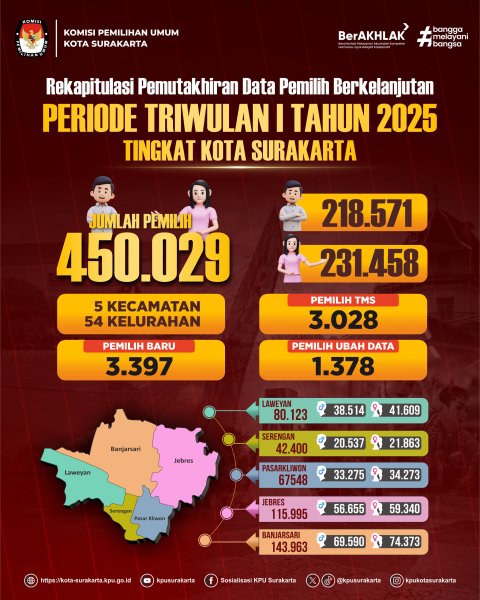 Surakarta, kota-surakarta.kpu.go.id - KPU Kota Surakarta telah selesai melaksanakan Rapat Pleno Rekapitulasi Pemutakhiran Data Pemilih Berkelanjutan pada hari Kamis (02/04/2026). Berikut kami sampaikan Infografis Rincian Data yang telah di mutakhir kan oleh KPU Kota Surakarta dengan jumlah total 450.029 pemilih dengan rician 218.571 pemlih laki-laki dan 231.458 pemilih perempuan. ....