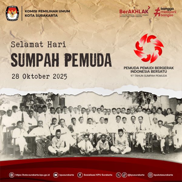 Hai #temanpemilih KPU Kota Surakarta mengucapkan Selamat Hari Sumpah Pemuda, 28 Oktober 2025. Pemuda bersatu, Indonesia maju. Tak ada kata menyerah bagi generasi penerus bangsa.