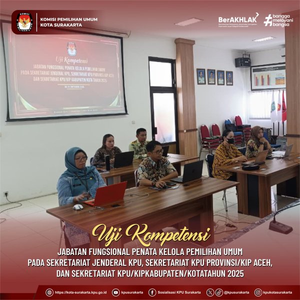 Ujian Kompetensi dilakukan di Aula Kantor KPU Kota Surakarta. Tujuan pelaksanaan kegiatan ini adalah meningkatkan profesionalisme dan motivasi ASN, menyiapkan SDM berbasis merit system, menegaskan karier ASN KPU berbasis kompetensi & integritas. (Ed : Asa/kpusurakarta)