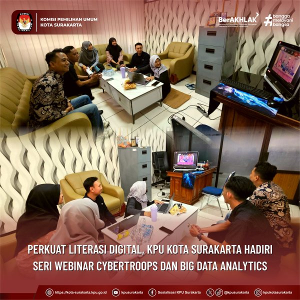 Surakarta, kota-surakarta.kpu.go.id - Komisi Pemilihan Umum (KPU) Kota Surakarta mengikuti kegiatan Webinar dengan tema “Cybertroops: Pemanfaatan Big Data Analytics untuk Perbaikan Demokrasi di Indonesia”. Kegiatan ini diselenggarakan oleh Pusat Data dan Informasi (Pusdatin) KPU RI sebagai upaya peningkatan kapasitas jajaran penyelenggara pemilu dalam memahami dinamika ruang digital serta pemanfaatan data dalam menjaga kualitas demokrasi. Jumat, (05/12/2025)