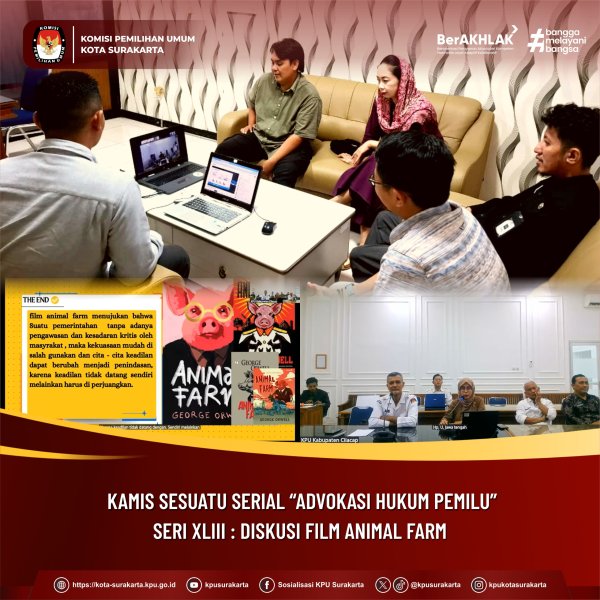 Surakarta, kota-surakarta.kpu.go.id - JDIH KPU Provinsi Jawa Tengah kembali hadir dengan program unggulan Kamis Sesuatu Serial 'Advokasi Hukum Pemilu' Seri XLIII. Kali ini menyelami pesan-pesan mendalam dalam "Diskusi Film Animal Farm". Hadir Sebagai Narasumber Munjiatun Mukaromah, S.Pd.I (Ketua Divisi Hukum dan Pengawasan KPU Kabupaten Cilacap); serta Moderator diisi oleh Hari Sugiharto, S.H., M.H.