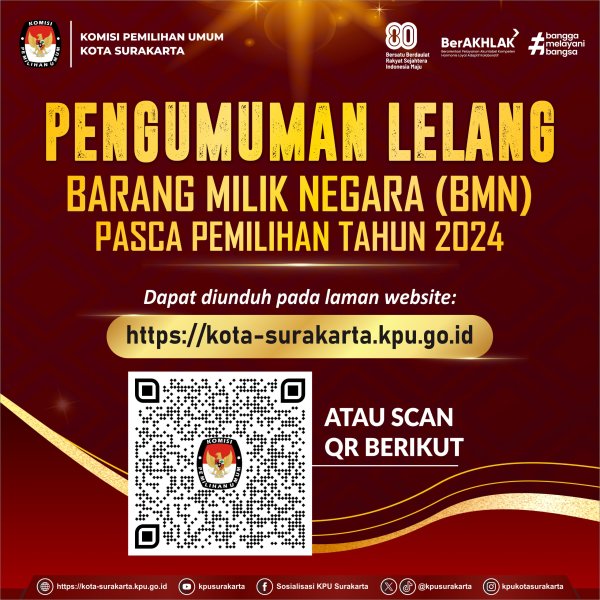 Surakarta, kota-surakarta.kpu.go.id - Berikut Pengumuman Lelang Barang Milik Negara Berupa Satu Paket Barang Persediaan Pasca Pemilu/Pemilihan Pada KPU Kota Surakarta. Pengumuman dapat dilihat dan diunduh pada link berikut ini :