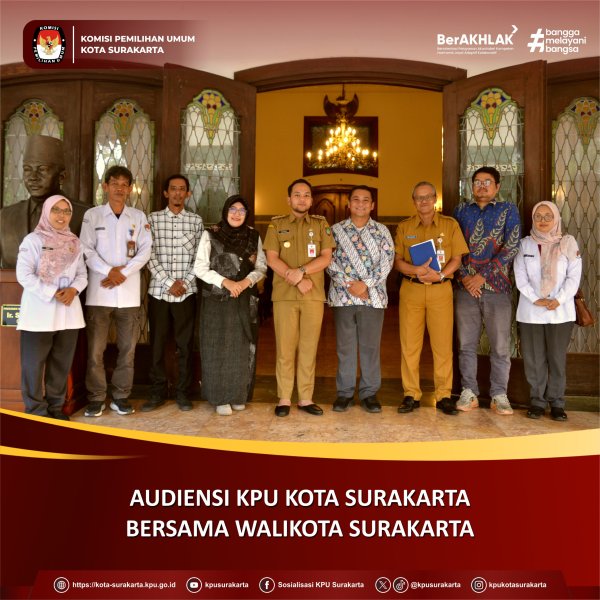Surakarta, kota-surakarta.kpu.go.id - Komisi Pemilihan Umum Kota Surakarta melakukan audiensi dan silaturahmi dengan Walikota Surakarta, Respati Achmad Ardianto. Rombongan KPU Kota Surakarta diterima di Rumah Dinas Walikota Surakarta, Loji Gandrung, Senin (28/07/2025). Hadir dalam audiensi tersebut Ketua KPU Kota Surakarta, Yustinus Arya Artheswara didampingi oleh Anggota KPU Kota Surakarta, turut hadir Sekretaris KPU Kota Surakarta, Tanto Winurdin. Dalam kesempatan ini, Arya menyampaikan maksud dan tujuan audiensi tersebut, yakni penyampaian laporan dan buku yang disusun oleh KPU Kota Surakarta sekaligus penyampaian permohonan dukungan atas rencana-rencana kegiatan yang terkait dengan pendidikan politik untuk masyarakat Kota Surakarta di masa non tahapan. Respati yang didampingi oleh Sekretaris Daerah Kota Surakarta, Budi Murtono, menyampaikan terima kasih atas kerja-kerja KPU selama penyelenggaraan Pemilu dan Pemilihan Tahun 2024 kemarin di Kota Surakarta. Pemerintah Kota Surakarta akan mendukung rencana KPU Kota Surakarta dalam rangka mencerdaskan masyarakat Kota Surakarta dalam berpolitik. "rencana pendidikan politik ini sangat bagus sekali, dalam memberikan pengetahuan dan meningkatkan kesadaran masyarakat dalam berpolitik, sehingga mayarakat sadar akan peran penting mereka dalam kehidupan berpolitik" tambah respati. Audiensi diakhiri dengan penyerahan buku serta foto bersama, selain itu Respati juga memberikan pesan kepada masyarakat kota Surakarta untuk menyukseskan kegiatan Pemutakhiran Data Pemilih Berkelanjutan yang saat ini sedang dilaksanakan oleh KPU Kota Surakarta. (Ed : Wil/kpusurakarta)