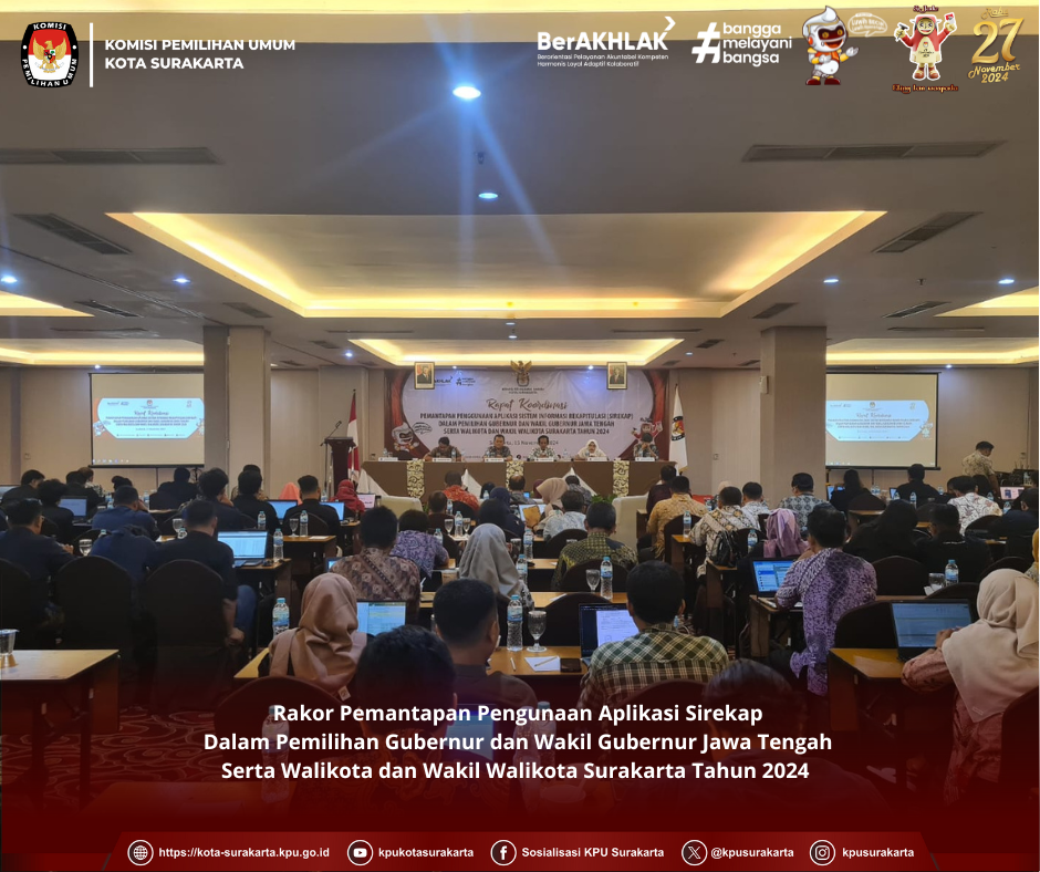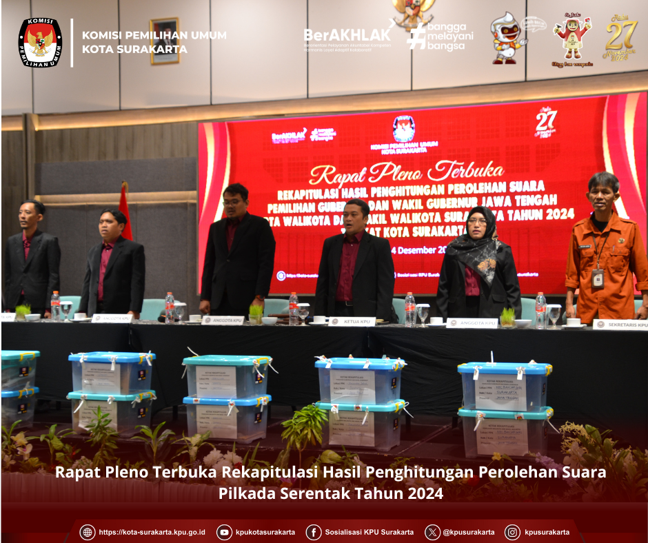 Surakarta, kota-surakarta.kpu.go.id - Komisi Pemilihan Umum (KPU) Kota Surakarta menggelar Rapat Pleno Terbuka Rekapitulasi Penghitungan Hasil Perolehan Suara Pilkada Serentak Tahun 2024. Rabu, (4/12). Kegiatan dilaksanakan di Hotel Solia Zigna, Laweyan, Kota Surakarta. Kegiatan diawali dengan menyanyikan lagu kebangsaan Indonesia Raya dilanjutkan dengan Sambutan Ketua KPU Kota Surakarta, Yustinus Arya Artheswara. Dalam Sambutannya menyampaikan beberapa hal mengenai tahapan Pilkada yang sudah dilalui sampai dengan saat ini. “Hari Pemungutan Suara sudah kita lalui dan Puji Tuhan berjalan dengan lancar tanpa ada suatu kendala apapun, penghitungan perolehan tiap TPS serta rekapitulasi tingkat PPK juga berjalan dengan lancer, kami mengucapkan terimakasih untuk kerjasama nya sampai dengan tahapan Penetapan pasangan calon terpilih Selesai kita laksanakan. Ujar” Arya. Rapat Pleno Terbuka Rekapitulasi Penghitungan Hasil Perolehan Suara Pilkada Serentak Tahun 2024 dibuka dan dipimpin langsung oleh Ketua KPU Kota Surakarta. Diawali dengan pembukaan segel kotak rekapitulasi dan hasil perolehan tingkat kecamatan serta pembacaan Perolehan hasil oleh Ketua PPK masing-masing wilayah kerjanya. Pembacaan rekapitulasi hasil perolehan suara dimulai dari Pemilihan Gubernur Dan Wakil Gubernur Jawa Tengah dilanjutkan dengan Pemilihan Walikota Dan Wakil Walikota Surakarta. Selain itu juga dibacakan form kejadian khusus hasil pleno tingkat kecamatan oleh Ketua KPU. Dilanjutkan dengan pembacaan serta penyusunan D. Hasil Tingkat Kota Surakarta oleh Ketua KPU Kota Surakarta. Rekapitulasi Hasil Perolehan Suara Pemilihan Gubernur Jawa Tengah Di Tingkat Kota Surakarta Untuk Pasangan Jenderal TNI (Purn.) H. Andika M Perkasa S.E., M.A., M.Sc. dan Dr. H. Hendrar Prihadi Alias Hendi, S.E., M.M Nomor Urut 1 sebanyak 161.008 (52,83%) suara, Pasangan Ahmad Luthfi dan Taj Yasin Nomor urut 2 sebanyak 143.738 (47,17 %), selanjutnya Rekapitulasi Hasil Perolehan Suara Pemilihan Walikota dan Wakil Walikota Surakarta Untuk Pasangan Teguh Prakosa dan Bambang Nugroho Nomor Urut 1 sebanyak 121.471 (39,51%) suara, pasangan Respati Achmad Ardianto, S.H., M.Kn dan Astrid Widayani, S.S., S.E., M.B.A Nomor Urut 2 sebanyak 185.970 (60,49%) Suara. Pada Pilkada Serentak 27 November 2024 partisipasi pemilih di kota Surakarta sebanyak 73,96 % Pemilih menggunakan hak pilih untuk Pemilihan Gubernur Dan Wakil Gubernur Jawa Tengah, serta 73,84 % Pemilih menggunakan hak pilih untuk Pemilihan Walikota Dan Wakil Walikota Surakarta Tahun 2024 dari jumlah total Daftar Pemilih Tetap (DPT) Kota Surakarta sebanyak 442.975 pemilih. Selesai pembacaan hasil perolehan suara tingkat kota Surakarta dilanjutkan dengan tanda tangan pengesahan hasil oleh ketua dan anggota KPU Kota Surakarta D. Hasil juga ditanda tangani oleh para saksi masing-masing pasangan calon serta penyerahan D. Hasil Tingkat Kota Surakarta kepada para saksi pasangan calon dan juga Bawaslu kota Surakarta. (Ed:Asa/kpusurakarta)