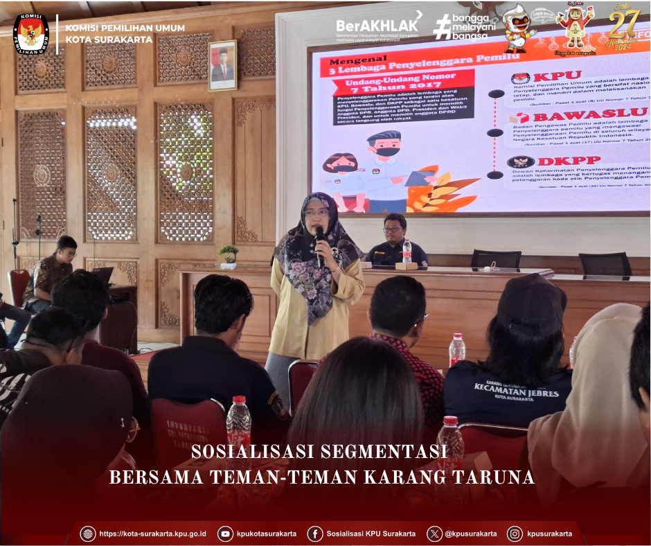 Surakarta, kota-surakarta.kpu.go.id - KPU Kota Surakarta melaksanakan kegiatan Sosialisasi dan Pendidikan Pemilih di segmen Karang Taruna di Kota Surakarta. Kegiatan dilaksanakan di Kantor Kecamatan Pasar Kliwon, Kota Surakarta dengan jumlah peserta 50 orang, terdiri dari Ketua dan Anggota Karang Taruna se - Kota Surakarta. Sabtu, (18/10) Acara dimulai dengan sambutan dari Ketua Karang Taruna, Ikhsan. Dalam sambutannya menyampaikan kegiatan sosialisasi yang dilaksanakan dan difasilitasi KPU merupakan salah satu rangkaian dari tahapan dalam Pemilihan Walikota dan Wakil Walikota Surakarta Tahun 2024. Hal ini merupakan upaya KPU dalam meningkatkan partisipasi anak muda dalam menyuarakan hak pilih. Selanjutnya, materi sosialisasi disampaikan Anggota Divisi Sosdiklih, Parmas dan SDM KPU Kota Surakarta, Yuly Yulianingrum. Menyampaikan bahwa saat ini KPU Kota Surakarta sangat menaruh harapan besar bagi anak-anak muda, khususnya gen milenial dan gen Z yang sangat potensial diukur dari syarat usia memilih. Hal ini juga dipandang memberi pengaruh besar bagi paslon yang akan melaksanakan kampanye, karena jumlah pemilih dikalangan anak muda sangat tinggi. Setelah pemaparan materi, dilanjutkan sesi tanya jawab, saran dan masukan. Adapun beberapa saran dan masukan seperti, pentingnya penyampaian materi yang tepat sasaran bagi kaum muda, dalam hal sejarah kepemiluan. Kegiatan sosialisasi dilanjutkan dengan melakukan cek dpt online bagi peserta. (Ed:Asa/kpusurakarta)