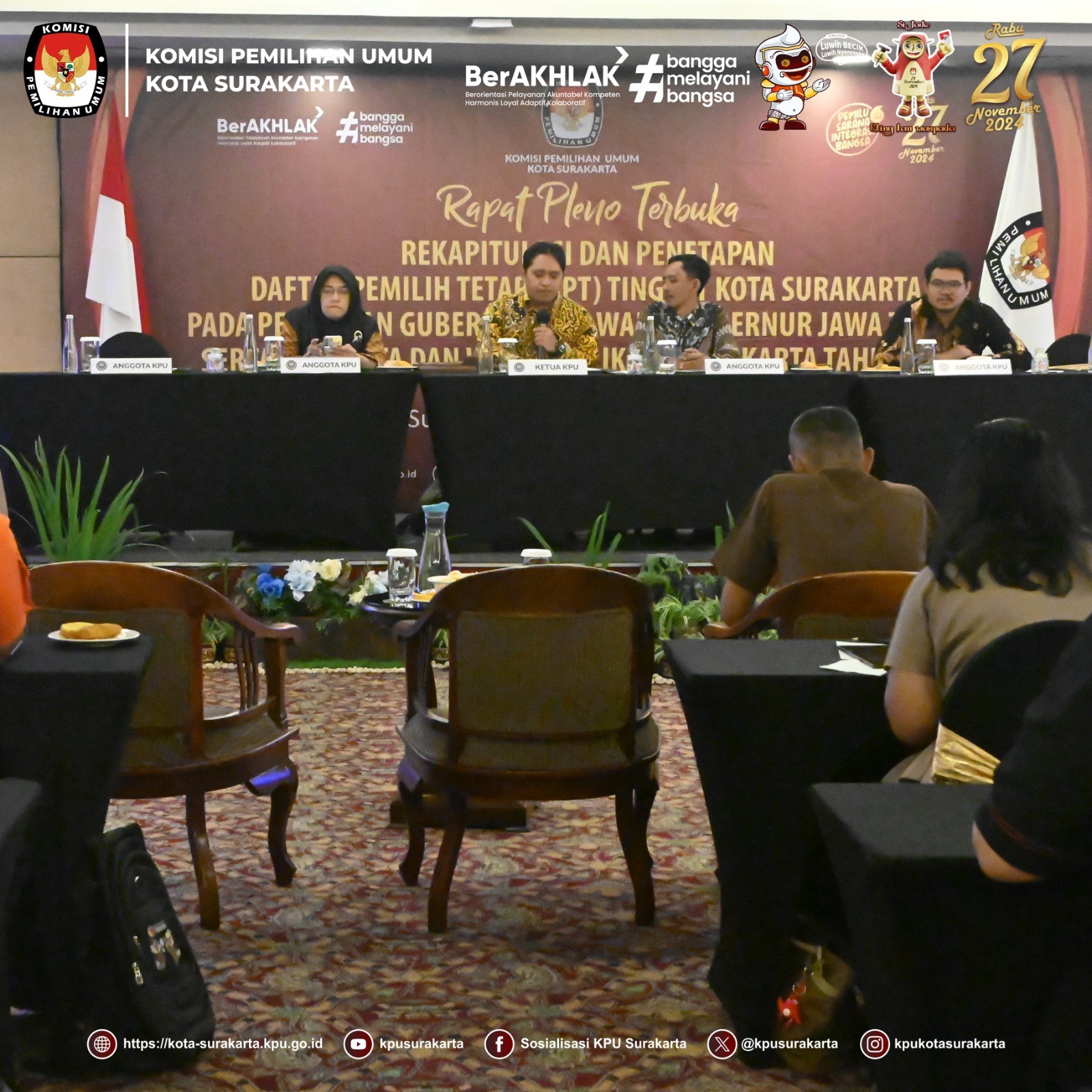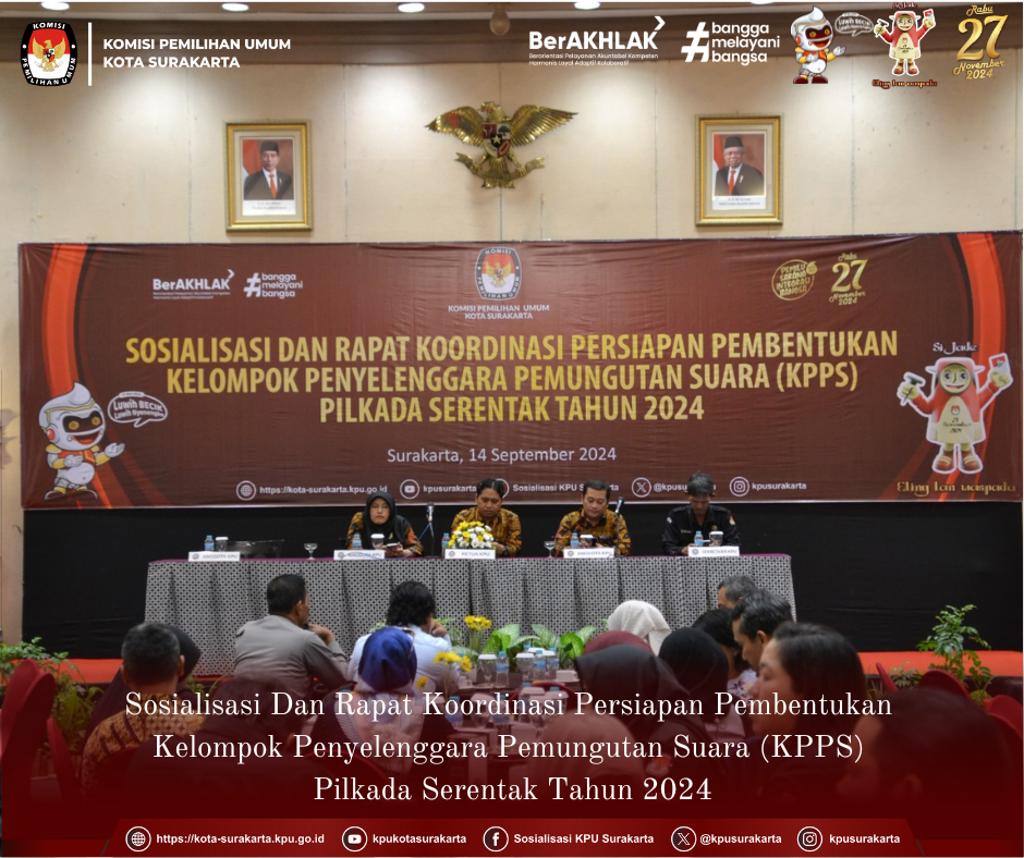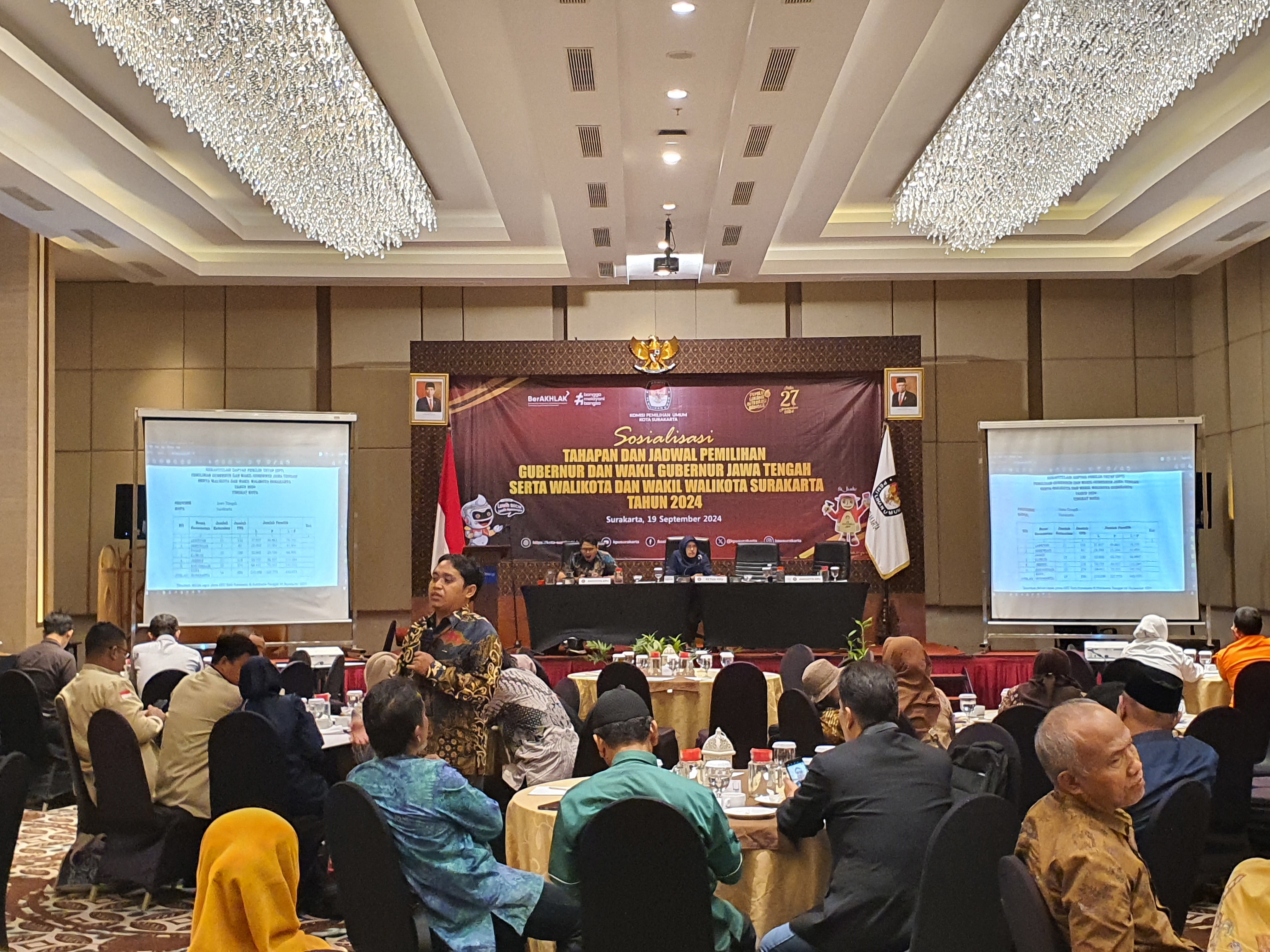Surakarta, kota-surakarta.kpu.go.id - Komisi Pemilihan Umum (KPU) Kota Surakarta menggelar kegiatan Sosialisasi Tahapan Dan Jadwal Pemilihan Gubernur Dan Wakil Gubernur Jawa Tengah Serta Walikota Dan Wakil Walikota Surakarta Tahun 2024 di Hotel Aston Surakarta. Kamis (19/9). Diawali dengan Pembukaan dan sambutan oleh ketua KPU Kota Surakarta Bambang Cristanto, berkaitan dengan tahapan dan jadwal KPU dan Surakarta wajib menginformasikan selain lewat media sosial dan website Surakarta wajib menginformasikan seluruh tahapan dan jadwal Pilkada serentak tahun 2024 kepada masyarakat. KPU Kota Surakarta Sampai dengan saat ini pada tanggal 18 September 2024 sudah menetapkan daftar pemilih tetap di tingkat kota Surakarta dalam Pilkada Serentak 2024 sejumlah 442.957 pemilih, sebelum penetapan pada tanggal 17 dilakukan sinkronisasi data dengan Bawaslu. Setelah penetapan DPT akan ada pemeliharaan data pemilih guna untuk mendata jika ada warga masyarakat yang belum terdaftar di dalam daftar pemilih tetap. Selanjutnya untuk tahapan pencalonan sudah ada dua bapaslon yang mendaftar di hari terakhir pada tgl 29 Agustus 2024 dan KPU Kota Surakarta juga sudah melakukan verifikasi data dan selanjutnya KPU Kota Surakarta akan menetapkan paslon Walikota dan wakil walikota Surakarta Tahun 2024. Selanjutnya penyampaian materi dari Kadiv Sosdiklih Parmas dan SDM Yuly Yulianingrum, ada beberapa pengarahan yang pertama mengenai partisipasi masyarakat diharapkan meningkat pada Pilkada Serentak. Pada Divisi Sosdiklih Parmas dan SDM sudah melakukan rencana kegiatan sosialisasi antara lain sosialisasi di Car Free Day, KPU Goes To Kampus dan School serta kerjasama dengan Diskominfo untuk penayangan konten di media publikasi Pemkot kerjasama dengan Bapenda mengenai pemasangan baliho 5 titik, jalan sehat Pemilu, Solo bersholawat dan Sosialisasi pada 5 segmen. Meningkatkan Partisipasi pemilih pada Pilkada Serentak 2024 dengan cara sosialisasi dan pendidikan pemilih khususnya terhadap pemilih pemula di Kota Surakarta. Ada beberapa program antara lain program kerjasama dengan sekolah-sekolah diantaranya dalam proyek penguatan profil belajar Pancasila pemilihan ketua OSIS dan pemilihan BEM kampus dan Surakarta juga memanfaatkan sarana edukatif melalui kunjungan di rumah pintar pemilu atau RPP, galeri literasi demokrasi Selain itu KPU Kota Surakarta juga memanfaatkan media sosial sebagai sarana publikasi informasi kepemiluan sesuai dengan kebutuhan masyarakat digital saat ini yang didominasi oleh generasi Z. Dilanjutkan materi Hukum dan Pengawasan salah satunya disampaikan produk hukum tahapan Pilkada 2024 KPU Kota Surakarta menerbitkan beberapa SK antara lain SK Nomor 208 Tahun 2024 Tentang Penetapan Hari Dan Tanggal Pemungutan Suara Pemilihan Walikota Dan Wakil Walikota Tahun 2024, SK Nomor 209 Tahun 2024 Tentang Pedoman Teknis Tahapan Dan Jadwal Penyelenggaraan Pemilihan Walikota Dan Wakil Walikota Surakarta Tahun 2024 selanjutnya SK Nomor 211 Tahun 2024 Tentang Pedoman Teknis Pendaftaran Pemantau Pemilihan Walikota Dan Wakil Walikota Surakarta Tahun 2024. Selain itu juga ada inventarisasi kebutuhan produk hukum surat keputusan tentang kampanye ada SK juknis, SK Lokasi, SK Jadwal, SK Fasilitas Pelaporan Dana Kampanye, SK Audit SK dan Pembatasan Dan Kampanye. Kadiv Teknis Jati Narendro Pratignyotiyoso menyampaikan beberapa tahapan Teknis antara lain pencalonan, persiapan untuk tahapan kampanye, mempersiapkan pelaporan Dana kampanye dan memberi arahan untuk tim pemenangan Pasangan calon segera untuk mempersiapkan rekening dana kampanye untuk keperluan pelaporan Dana kampanye. Selain itu segera melaporkan struktur tim kampanye Pasangan calon. Selanjutnya pada 22 September 2024 Penetapan Pasangan Calon secara internal dan pada 23 September Tahun 2024 pengundian nomor urut Pasangan calon walikota dan wakil walikota Surakarta tahun 2024 dan KPU Kota Surakarta akan melakukan simulasi pemungutan suara di TPS riil namun masih menunggu arahan KPU RI. Selanjutnya yang terakhir penyampaian pengarahan dan materi oleh Ketua KPU Kota Surakarta yang membidangi Kadiv Keuangan, Umum Dan Logistik menjelaskan kebutuhan logistik untuk perlengkapan pemungutan suara dan dukungan perlengkapan lainnya. TPS diharapkan yang aksesbilitas serta mudah dijangkau oleh semua kalangan masyarakat khususnya aksesibilitas untuk mempermudah pemilih disabilitas. Selain menjelaskan tentang kebutuhan logistik Pilkada tahun 2004 juga dijelaskan alur menggunakan hak pilihnya di dalam TPS. Menyampaikan himbauan kepada PPK PPS pada saat memberikan Bimtek kepada KPPS harus fokus agar meminimalisir kesalahan-kesalahan yang dialami oleh KPPS di TPS pada Pemilu Pilkada sebelumnya. Koordinasi dukungan pengelolaan logistik tingkat kecamatan pengadaan logistik tahap 1 penerimaan logistik yaitu bilik suara pada tanggal 16 September tahun 2024. Saat ini KPU Kota Surakarta sedang memasuki tahapan pendaftaran KPPS dengan masa pendaftaran pada tanggal 17-28 September Tahun 2024. Selanjutnya mewakili Kadiv Rendatin menyampaikan tentang Rekapitulasi Daftar Pemilih Tetap pada Pemilihan Gubernur Dan Wakil Gubernur Jawa Tengah Serta Walikota Dan Wakil Walikota Surakarta Tahun 2024 dengan jumlah total laki-laki 215.200 jumlah pemilih perempuan 227.775 dan jumlah pemilih laki-laki dan perempuan 442.975, Setelah penetapan DPT selanjutnya memasuki tahapan DPTB (daftar pemilih tambahan) KPU Kota Surakarta akan melayani pindah memilih bagi warga masyarakat yang pada hari pemungutan suara tidak bisa menggunakan hak pilih sesuai dengan alamat domisilinya masing-masing. Kegiatan sosialisasi tahapan dan jadwal Pilkada serentak tahun 2024 berjalan dengan lancar dan ditutup dengan diskusi tanya jawab. (Ed:Asa/kpusurakarta)