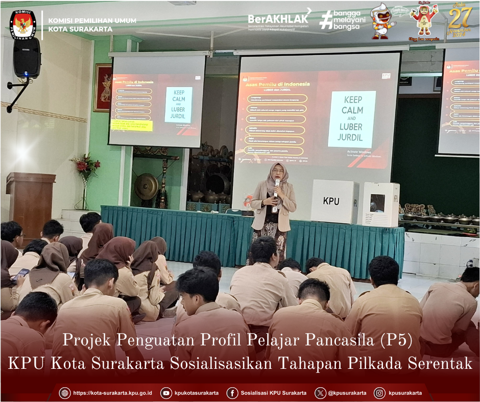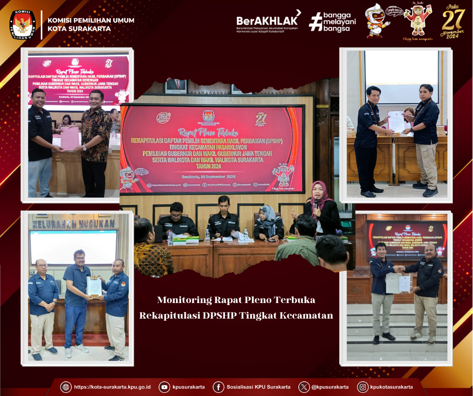 Surakarta, kota-surakarta.kpu.go.id - Komisi Pemilihan Umum (KPU) Kota Surakarta mengikuti Melakukan monitoring pelaksanaan Rapat Pleno Terbuka DPHP di tingkat Kecamatan se-Kota Surakarta, Selasa (10/9). Ketua dan Anggota,serta seluruh jajaran sekretariat KPU Kota Surakarta memonitoring pelaksanaan Rapat Pleno terbuka rekapitulasi DPSHP (Daftar Pemilih Sementara Hasil Pemutakhiran) di tingkat kecamatan se kota surakarta. Dibagi menjadi 5 kelompok komisioner beserta staf sekretariat melakukan monitoring sesuai dengan korwil masing-masing. Ketua KPU Kota Surakarta, Bambang Christanto melakukan monitoring di wilayah Kelurahan-kelurahan yang ada di Kecamatan Pasar Kliwon. “Saat ini dilkasanakan Pleno Rekapitulasi DPSHP di tingkat kecamatan, kami melakukan monitoring pelaksanaan pleno agar kita mengetahui jika ada kendala yang dialami oleh PPK maka kami dapat memberikan solusi terbaik, namun kami berharap Pleno tingkat Kelurahan ini berjalan dengan lancar tanpa ada suatu kendala apapun”.Pada kesempatan ini turut hadir Kadiv Parmas KPU Provinsi Jawa Tengah bu Aklmaliyah untuk melaksanakan monitoring berjalannya pleno persiapan DPT di KPU Kabupaten/Kota”. Ujar Bambang. Komisioner KPU Provinsi Jawa Tengah juga memberikan arahan serta motivasi untuk peserta rakor PPS dan PPK Kecamatan Pasar Kliwon. Monitoring pelaksanaan ini bertujuan untuk memberikan motivasi kepada tingkat PPS dan PPK se-Kota Surakarta dalam melaksanakan tahapan Pilkada Serentak Tahun 2024. (Ed:Asa/kpusurakarta)