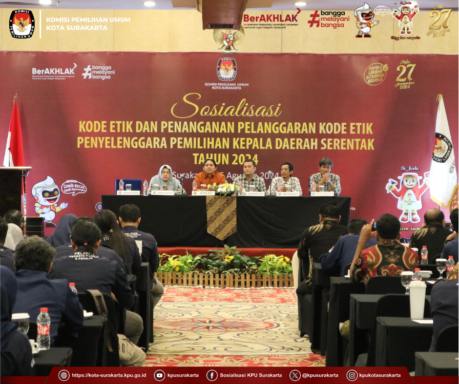 Kegiatan ini dilaksanakan di Hotel Sunan Kota Surakarta, Kegiatan dibuka dengan sambutan Ketua KPU Kota Surakarta, Bambang Cristanto. Dalam sambutannya menjelaskan bahwa Sosialisasi Kode Etik Dan Penanganan Pelanggaran Kode Etik Penyelenggara Pemilihan Kepala Daerah Serentak Tahun 2024 harus dipahami oleh seluruh peserta karena penyelenggara pemilu harus menjaga sikap perilaku di dalam setiap hal ataupun didalam setiap kegiatan. Menjaga Kode etik perilaku penyelenggara Pemilu sangat penting karena berkesinambungan dengan menjaga nama baik lembaga Komisi Pemilihan Umum. Selesai sambutan oleh Ketua KPU, Kadiv Parmas & SDM, Yuli Yulyaningrum memberikan pengarahan kepada seluruh PPK dan PPS se-Kota Surakarta tentang kedisiplinan badan AdHoc dalam menjalankan tugas sebagai Penyelenggara Pemilu.
