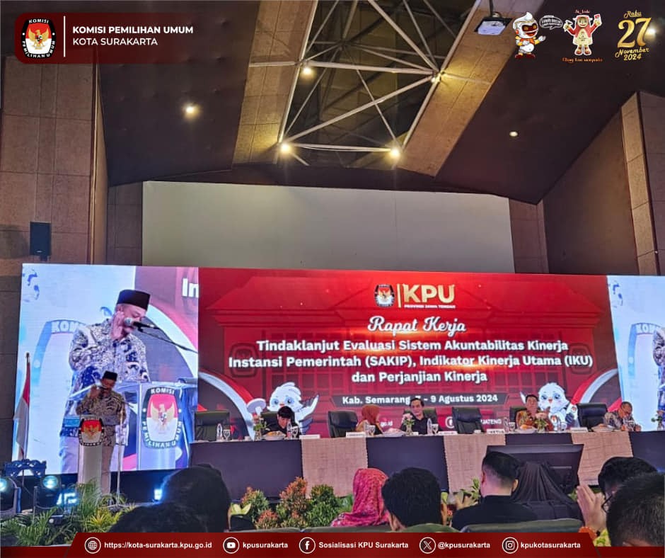 Surakarta, kota-surakarta.kpu.go.id - Komisi Pemilihan Umum (KPU) Kota Surakarta mengikuti Rapat Kerja Tindak Lanjut Evaluasi Sistem Akuntabilitas Kinerja Instansi Pemerintah (SAKIP), Indikator Kinerja Utama (IKU) dan Perjanjian Kinerja bersama KPU Provinsi Jawa Tengah, Rabu (7/24). Hadir Anggota KPU RI Yulianto Sudrajat dan memberikan pengarahan pada kegiatan yang dilaksanakan di Semarang ini. Pada pengarahannya menyampaikan “Bahwa rangkaian sistematik dari berbagai aktivitas, alat, dan prosedur yang dirancang untuk penetapan dan pengukuran, pengumpulan data, pengklasifikasian, pengikhtisaran, dan pelaporan kinerja pada instansi pemerintah, semua itu dalam rangka pertanggungjawaban dan peningkatan kinerja instansi pemerintah” ujar Drajat. Saat ini KPU sedang menyusun instrumen evaluasi yang berkelanjutan hingga ke provinsi, kabupaten/kota. Kuesioner untuk instrumen evaluasi ini akan segera diluncurkan ke semua satuan kerja. Akan ada beberapa indikator yang harus diisi oleh kabupaten/kota sehingga hasil dari yang sudah diisi dan dikumpulkan ke KPU akan direviu kepada pihak eksternal. Turut hadir, Ketua, dan Anggota serta jajaran Sekretariat KPU Provinsi Jawa Tengah, Ketua KPU Kota Surakarta, Bambang Christanto, Kadiv Rendatin, Aldian Andrew Wirawan serta Kasubbag Rendatin dan Operator SAKIP Kabupaten/Kota se-Jawa Tengah. (Ed:Asa/kpusurakarta)