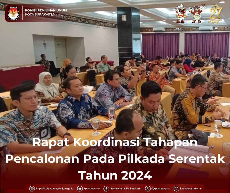 Surakarta, kota-surakarta.kpu.go.id - Komisi Pemilihan Umum (KPU) Kota Surakarta mengikuti acara Rapat Koordinasi Tahapan Pencalonan Dalam Pilkada Serentak Tahun 2024, Jumat (12/7). Kegiatan yang diselenggarakan oleh KPU Provinsi Jawa Tengah di Hotel Puri Garden Kota Semarang tersebut mengundang Ketua KPU,Anggota Divisi Teknis, Anggota Divisi Hukum serta Kasubbag Tpp & Parhupmas se-Kota Jawa Tengah Hadir dalam kegiatan tersebut, Ketua KPU, Bambang Christanto, Anggota KPU, Jati Narendro Divisi Teknis, Anggota KPU, Yustinus Arya Divisi Hukum & Pengawasan serta didampingi Kasubbag Tpp & Parhupmas KPU Kota Surakarta. Dalam Kegiatan ini KPU Provinsi Jawa Tengah berfokus pada pembahasan tahapan Pilkada Serentak yang akan digelar pada 27 November 2024 mendatang yakni Tahapan pencalonan pada Gubernur dan Wakil Gubernur, Bupati dan Wakil Bupati Serta Walikota dan Wakil Walikota Tahun 2024. KPU Kota Surakarta menghadiri kegiatan ini untuk dapat berkoordinasi dan mempersiapkan serta menjalankan tahapan-tahapan Pilkada Serentak dengan baik. (Ed:Asa/kpusurakarta)