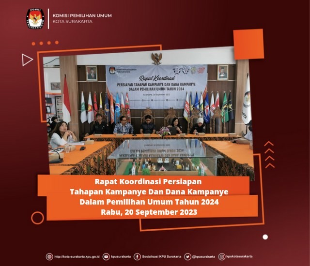 KPU Kota Surakarta (19/09) menyelenggarakan Rapat Kerja Persiapan Tahapan Kampanye dan Dana Kampanye Pemilu Tahun 2024. Kegiatan ini diikuti oleh peserta dari Partai Politik tingkat Kota Surakarta dan beberapa instansi terkait di Kota Surakarta.
