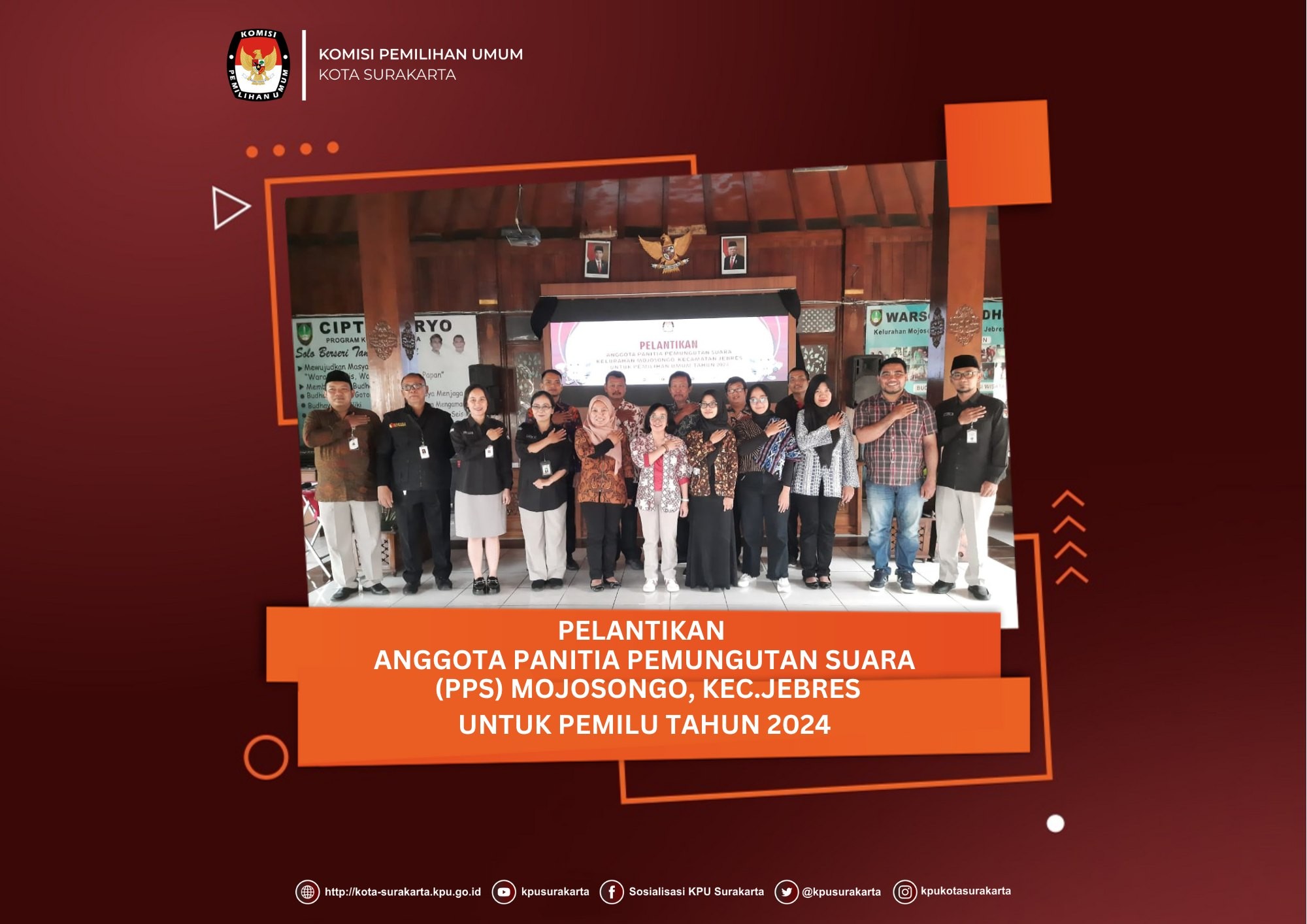 Ketua KPU Kota Surakarta, Nurul Sutarti melantik Pengganti Antar Waktu (PAW) Anggota Panitia Pemungutan Suara (PPS) Kelurahan Mojosongo, Kec. Jebres untuk Pemilihan Umum Tahun 2024, di Pendopo Kelurahan Mojosongo, Rabu (24/5).
