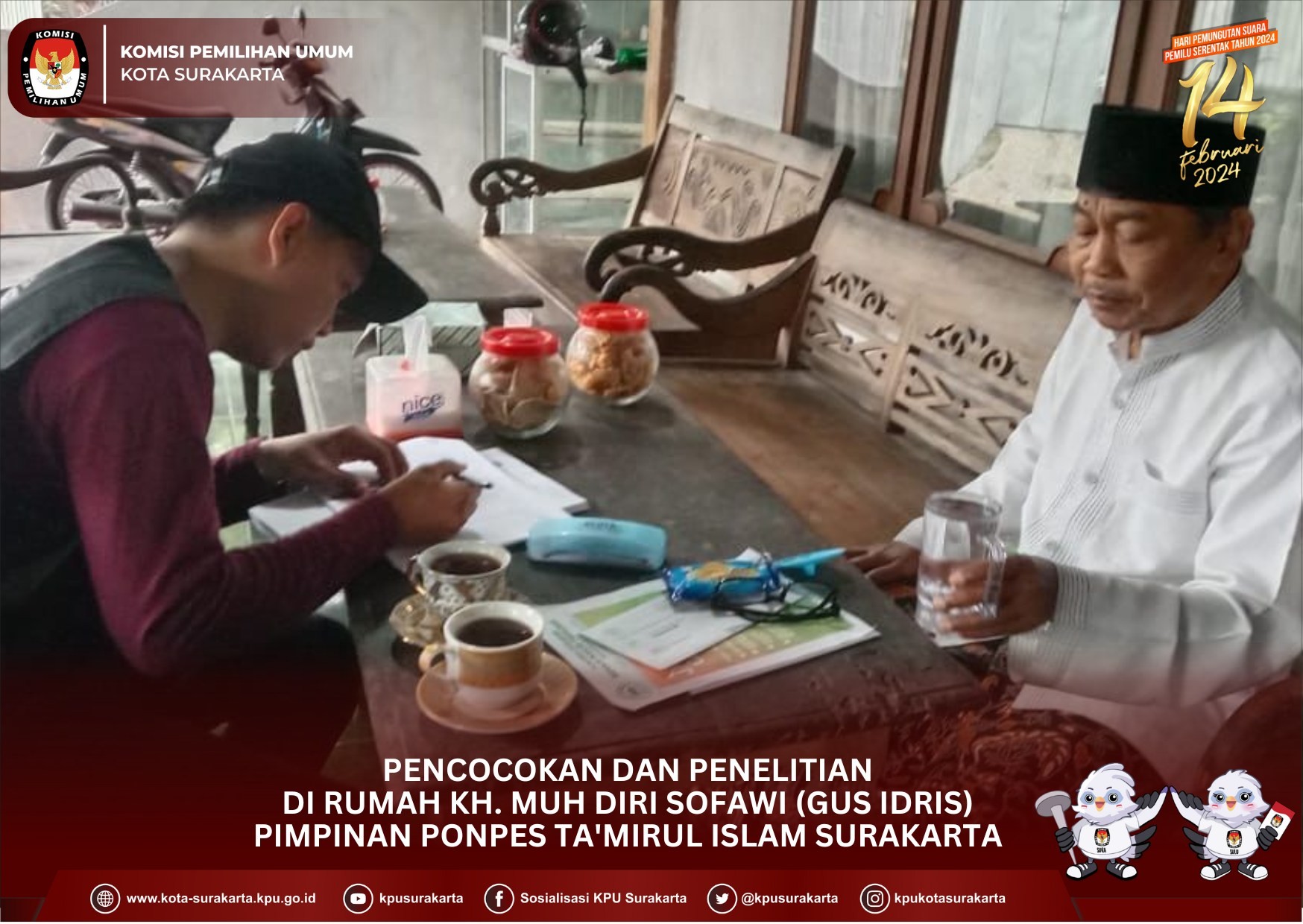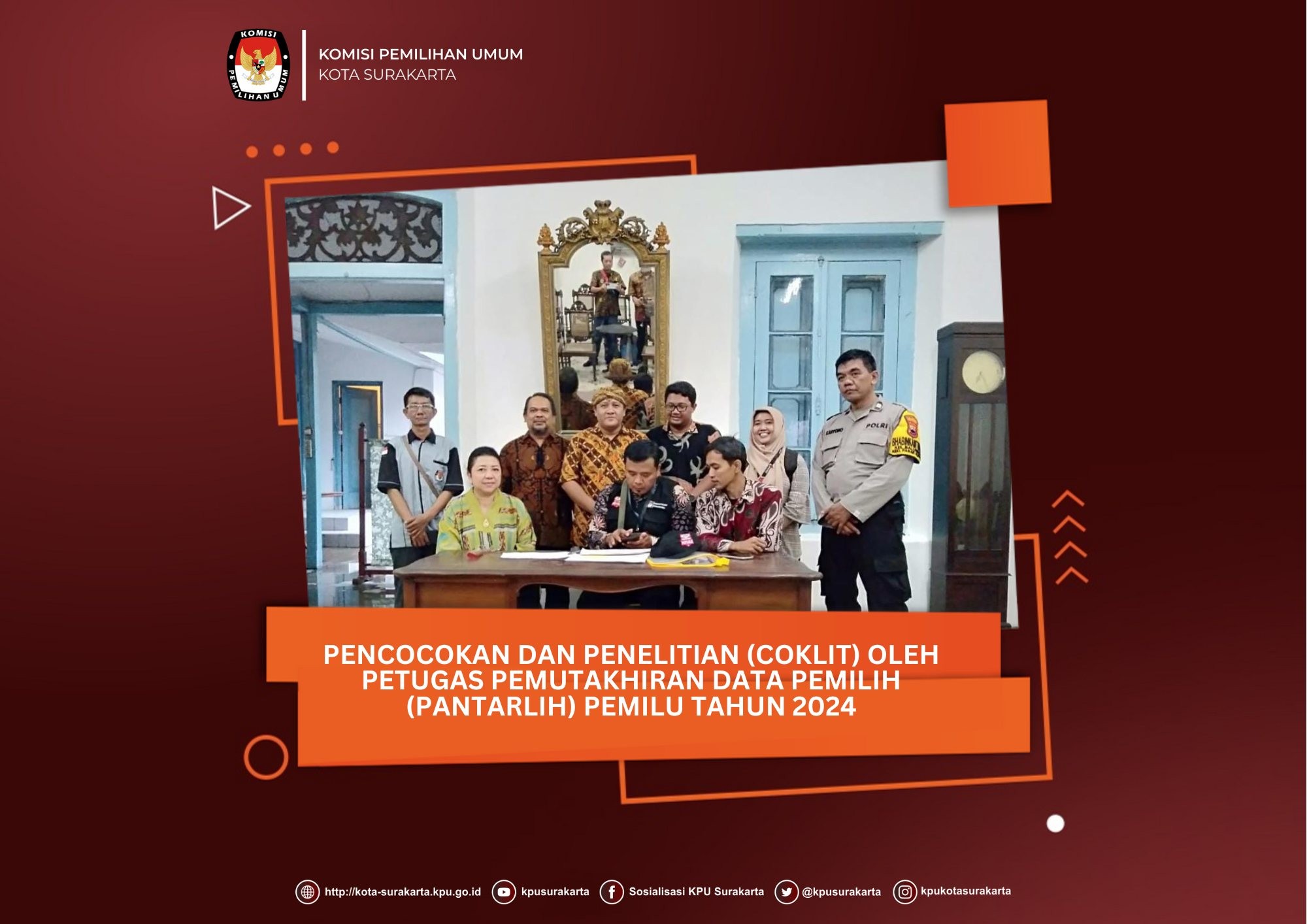 Setelah Pelantikan dan Apel Kesiapan, dan Bimbingan Teknis Pencocokan dan Penelitian bagi Petugas Pemutakhiran Daftar Pemilih (PANTARLIH) Pemilu 2024 Se Kota Surakarta dilaksanakan, pada Minggu tanggal 12 Februari 2023, Petugas Pantarlih segera melakukan COKLIT ke beberapa tokoh setempat. Beberapa tokoh yang telah dikunjungi dan dilakukan Pencocokan dan Penelitian (COKLIT) oleh PANTARLIH diantaranya adalah Keluarga Kraton Kasunanan Surakarta Hadiningrat, Gusti Moeng, Habib Syech Bin Abdul Qadir Assegaf, Anggota DPRD Kota Surakarta, Suyatno; dan Pendeta Edo dari GSJA Surakarta. Coklit dilaksanakan oleh Pantarlih yang juga didampingi oleh PPS dan PPK wilayah setempat dan diawasi oleh Pengawas Pemilu Lapangan (PPL), Panwaskel dan Panwascam. Kadiv Sosdiklih, Parman dan SDM, Bambang Christanto dan anggota lainnya turut berpartisipasi dan memonitoring langsung kegiatan coklit dihari pertama. Pelaksanaan Coklit untuk Pemilu Tahun 2024 oleh Pantarlih ini dilaksanakan dari tanggal 12 Februari s.d. 14 Maret 2023 di seluruh Indonesia. Bagi rumah yang sudah dicoklit akan ditandai dengan penempelan stiker tanda bukti telah dicoklit. #pemiluserentak2024 #kpumelayani #kpusurakarta