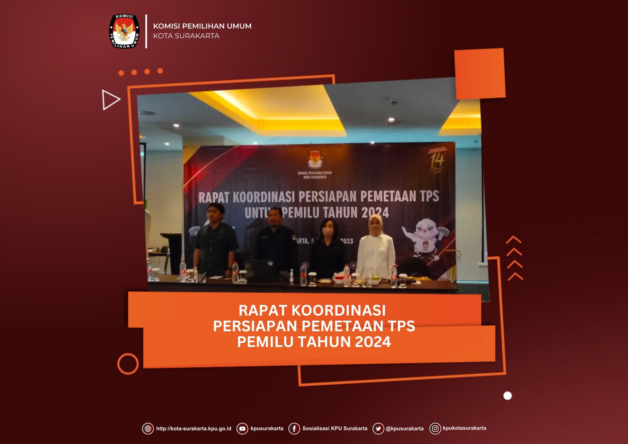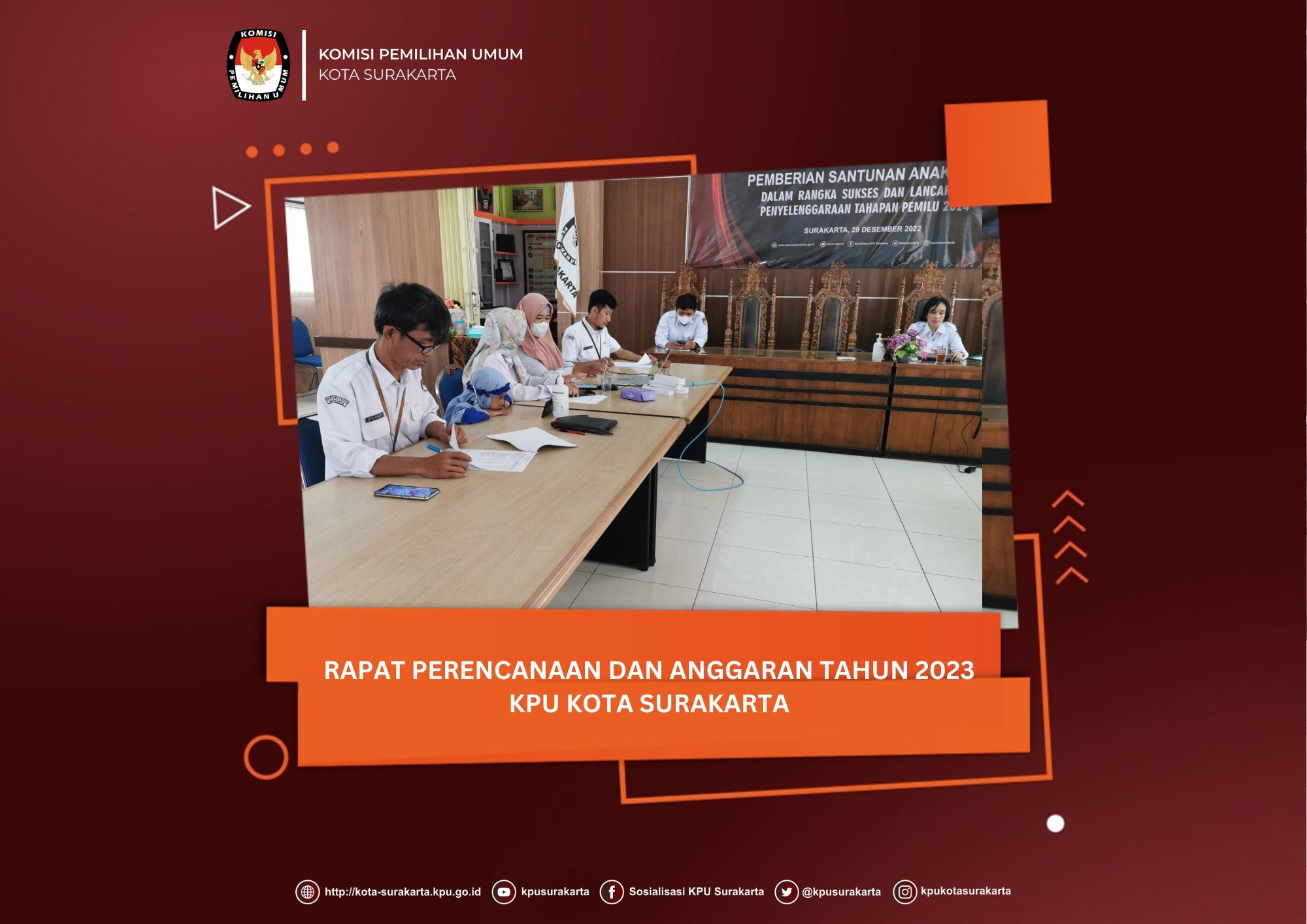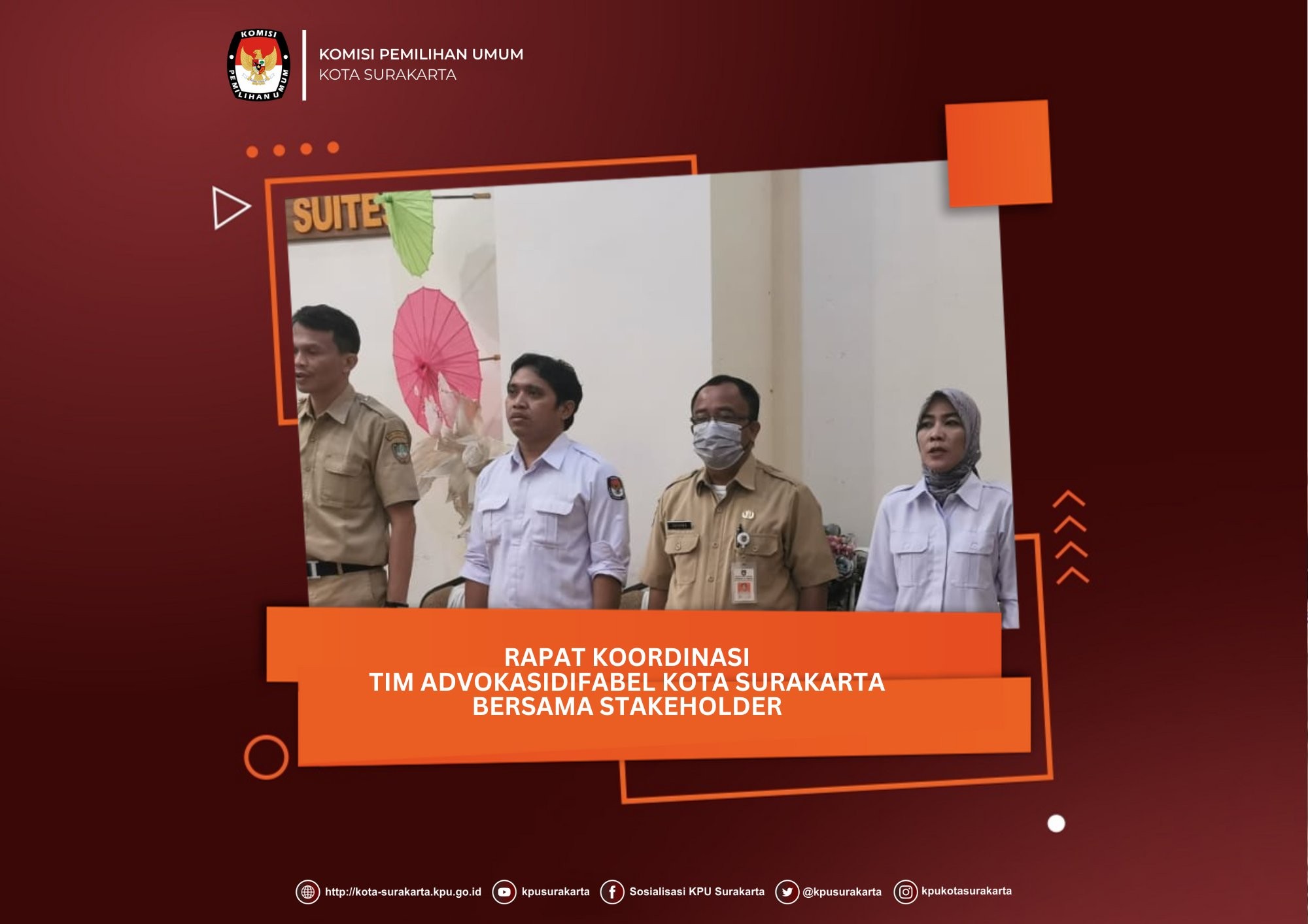 Ketua dan Wakil Ketua Divisi Sosdiklih, Parmas, dan SDM KPU Kota Surakarta, Bambang Christanto dan Puji Kusmarti menghadiri Rapat Koordinasi Tim Advokasi Difabel Kota Surakarta bersama stakeholder, pada Senin (9/1) Rapat Koordinasi ini dalam rangka peran Tim Advokasi Difabel yang mempunyai peran koordinasi dan menjadi jembatan antara Pemerintah Kota Surakarta dan Komunitas Disabilitas yang ada di Kota Surakarta sekaligus sebagai penampung aspirasi dan fasilitator dengan berbagai pihak terkait. Dengan adanya rapat koordinasi ini diharapkan mampu membentuk satu tujuan dan misi agar dapat berjalan beriringan untuk mecapai tujuan yaitu pemenuhan hak bagi penyandang disabilitas sekaligus sebagai wadah/media penghubung dari berbagai pemangku terkait. Pada kesempatan tersebut, Bambang Christanto menyampaikan bahwa teman-teman komunitas difabel dapat berpartisipasi aktif dalam Pesta Demokrasi diantaranya dengan mendaftar sebagai badan ad hoc (PPK, PPS, Pantarlih s/d KPPS) ataupun menjadi relawan demokrasi. Selain itu juga diharapkan dapat memberikan masukan kepada KPU terkait dengan TPS yang akses bagi teman-teman difabel maupun memberikan masukan terkait dengan surat suara (template braille) demi suksesnya Pemilu 2024 yang ramah disabilitas, tambahnya #kpumelayani #pemiluserentak2024 #kpusurakarta