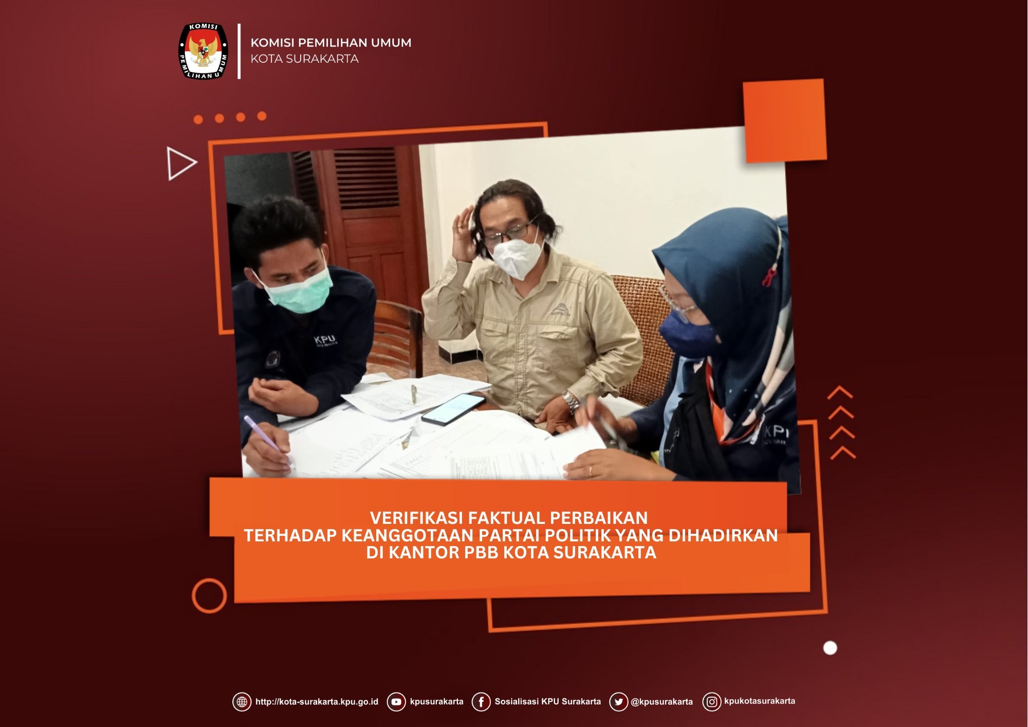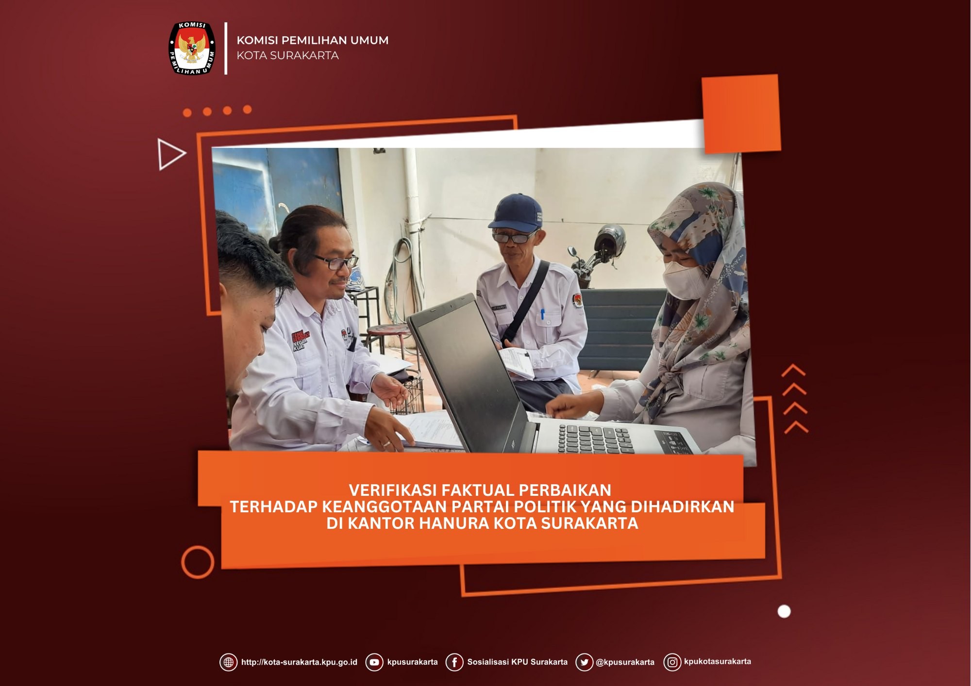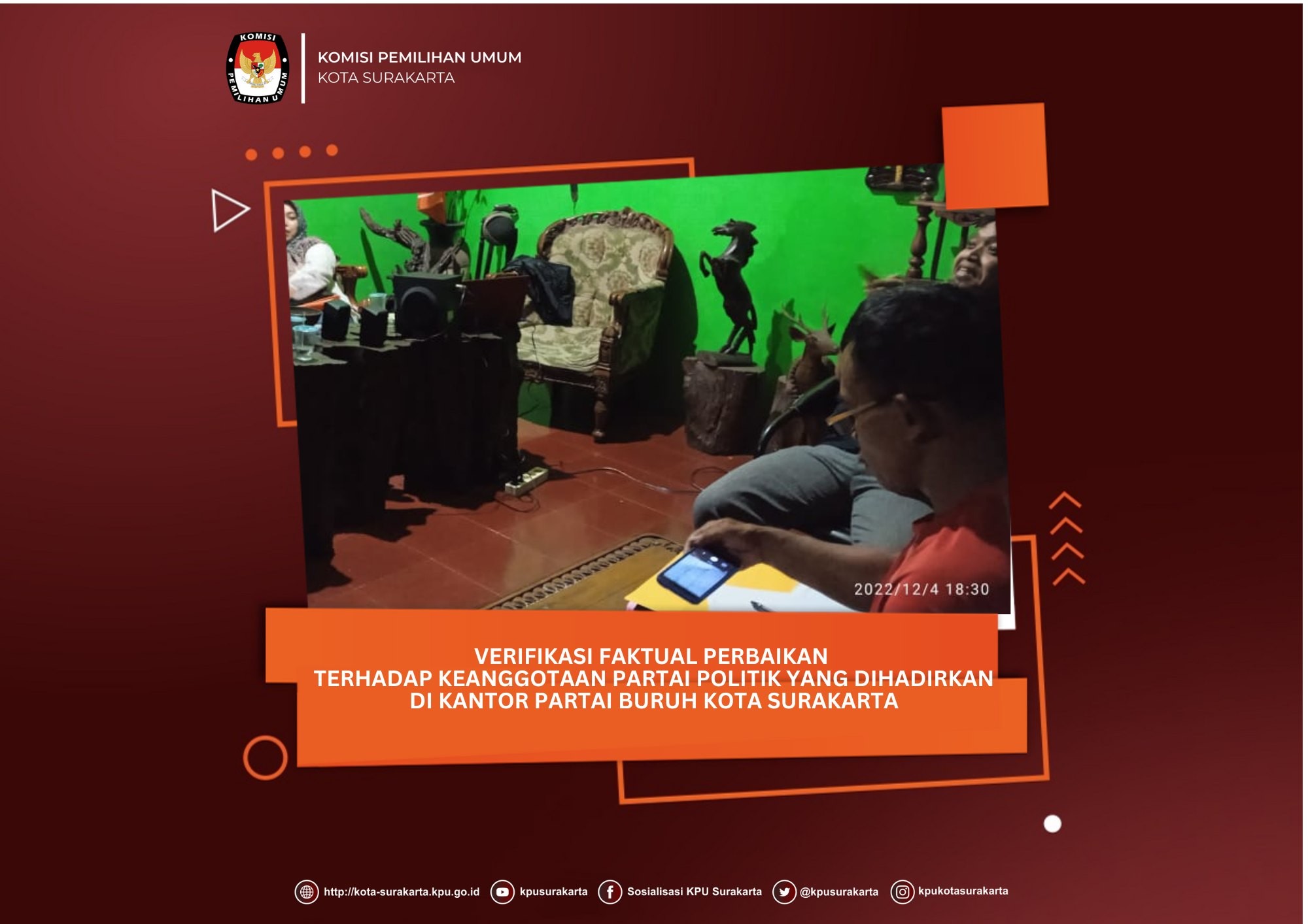 KPU Kota Surakarta melaksanakan Verifikasi Faktual Perbaikan terhadap dokumen persyaratan keanggotaan Partai Politik Calon Peserta Pemilu 2024 yang dihadirkan di kantor Partai Buruh, Jl. Mataram Baru No,2 Bayan RT.03/09, Banjarsari, Surakarta, dari tanggal 4 sd 7 Desember 2022. Tim Verifikator dipimpin oleh Ketua Divisi Sosdiklih, Parmas, dan SDM KPU Kota Surakarta, Bambang Christanto. Tim Verifikator diterima oleh Pengurus Partai Buruh Kota Surakarta. Turut hadir jajaran Bawaslu Kota Surakarta.