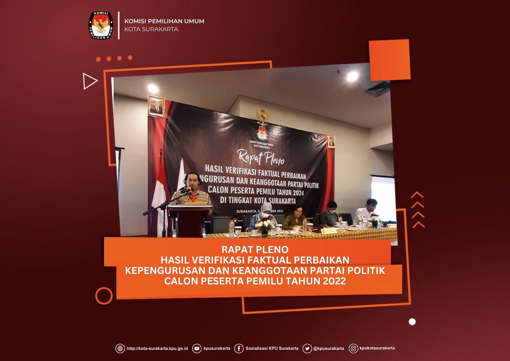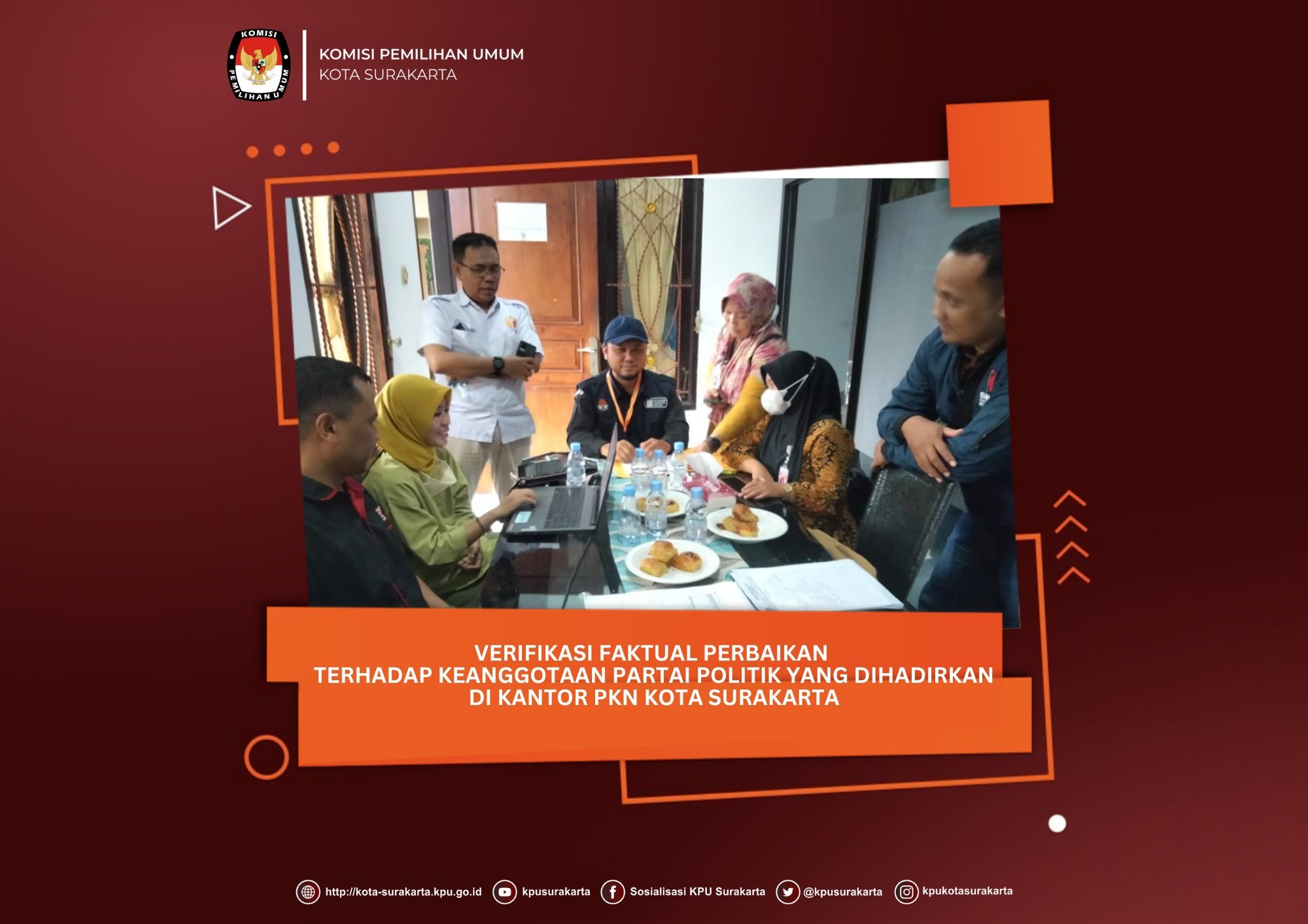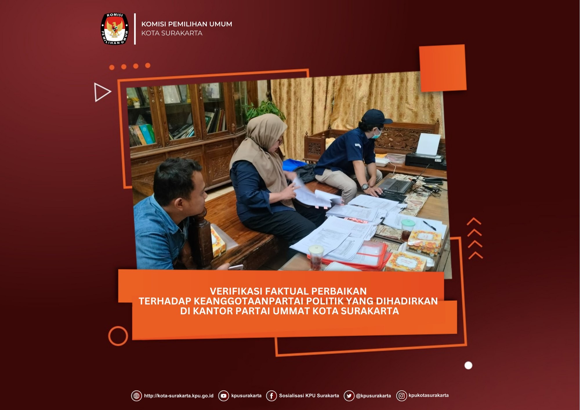 KPU Kota Surakarta melaksanakan Verifikasi Faktual Perbaikan terhadap dokumen persyaratan keanggotaan Partai Politik Calon Peserta Pemilu 2024 yang dihadirkan di kantor Partai Buruh, Jl. Mataram Baru No,2 Bayan RT.03/09, Banjarsari, Surakarta, dari tanggal 4 sd 7 Desember 2022. Tim Verifikator dipimpin oleh Ketua Divisi Sosdiklih, Parmas, dan SDM KPU Kota Surakarta, Bambang Christanto. Tim Verifikator diterima oleh Pengurus Partai Buruh Kota Surakarta. Turut hadir jajaran Bawaslu Kota Surakarta.