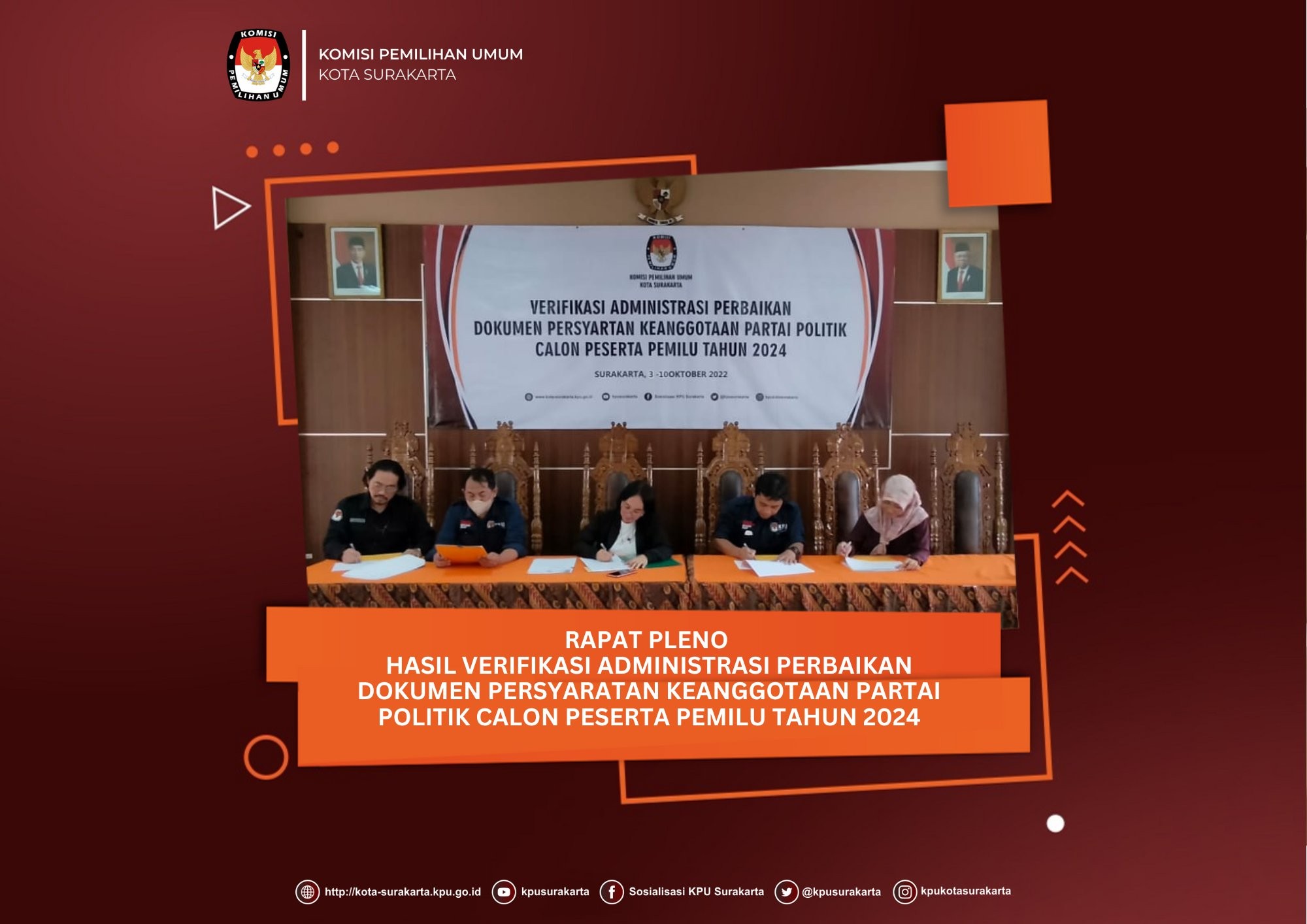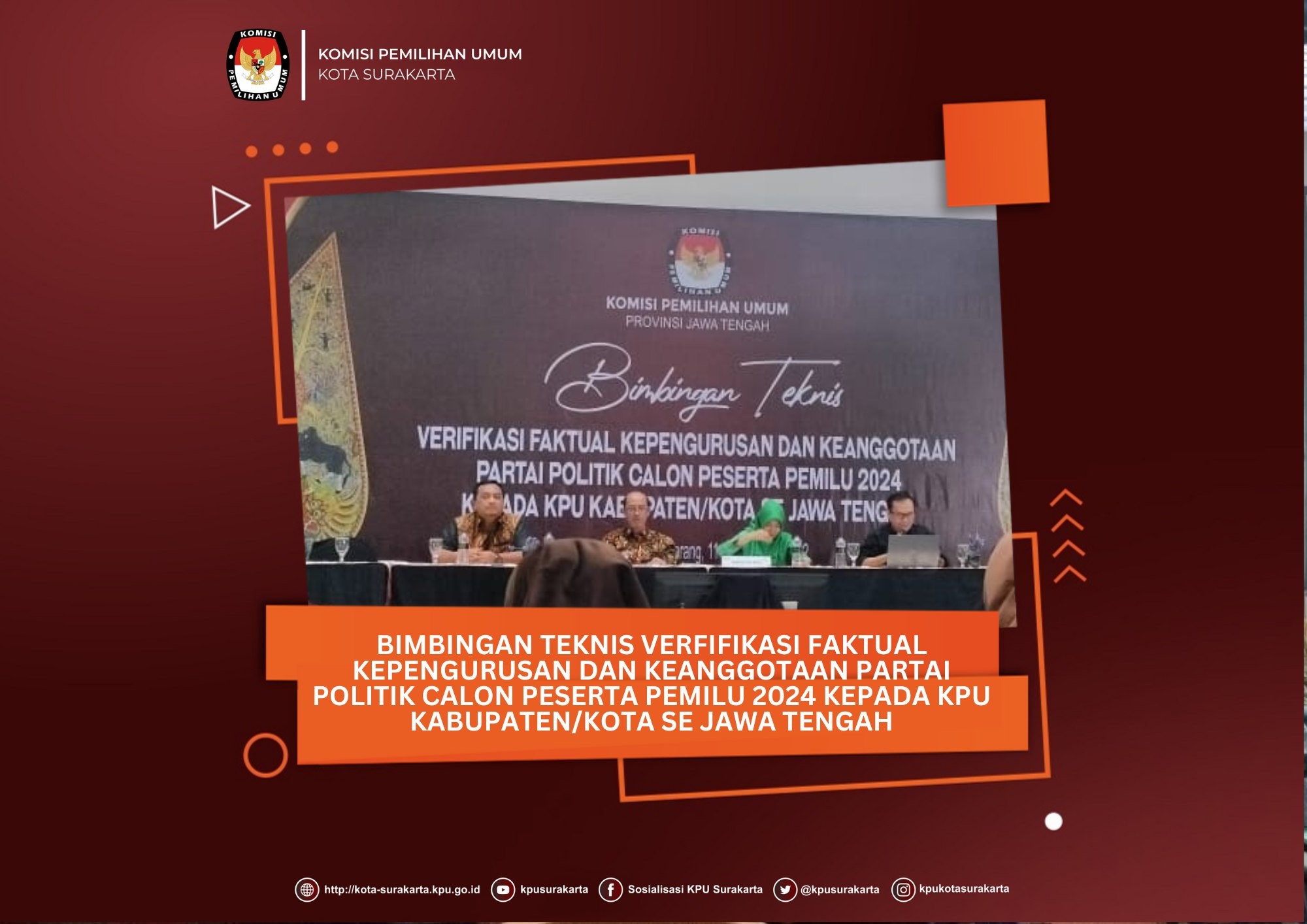 KPU Kota Surakarta mengikuti Bimtek Verifikasi Faktual Kepengurusan dan Keanggotaan Partai Politik Calon Peserta Pemilu 2024 yang diselenggarakan oleh KPU Provinsi Jawa Tengah dari tanggal 11 Oktober sampai dengan 13 Oktober 2022. Kegiatan ini diikuti oleh peserta dari 35 KPU Kab/Kota di Jawa Tengah yang terdiri dari Ketua dan Anggota, Sekretaris, Kasubbag Teknis dan Parhumas beserta Admin Sipol.