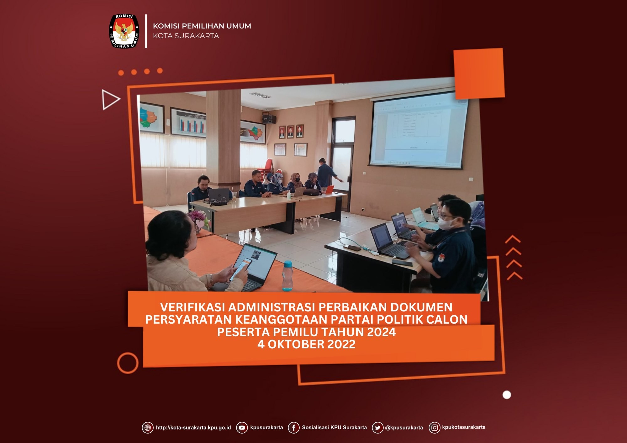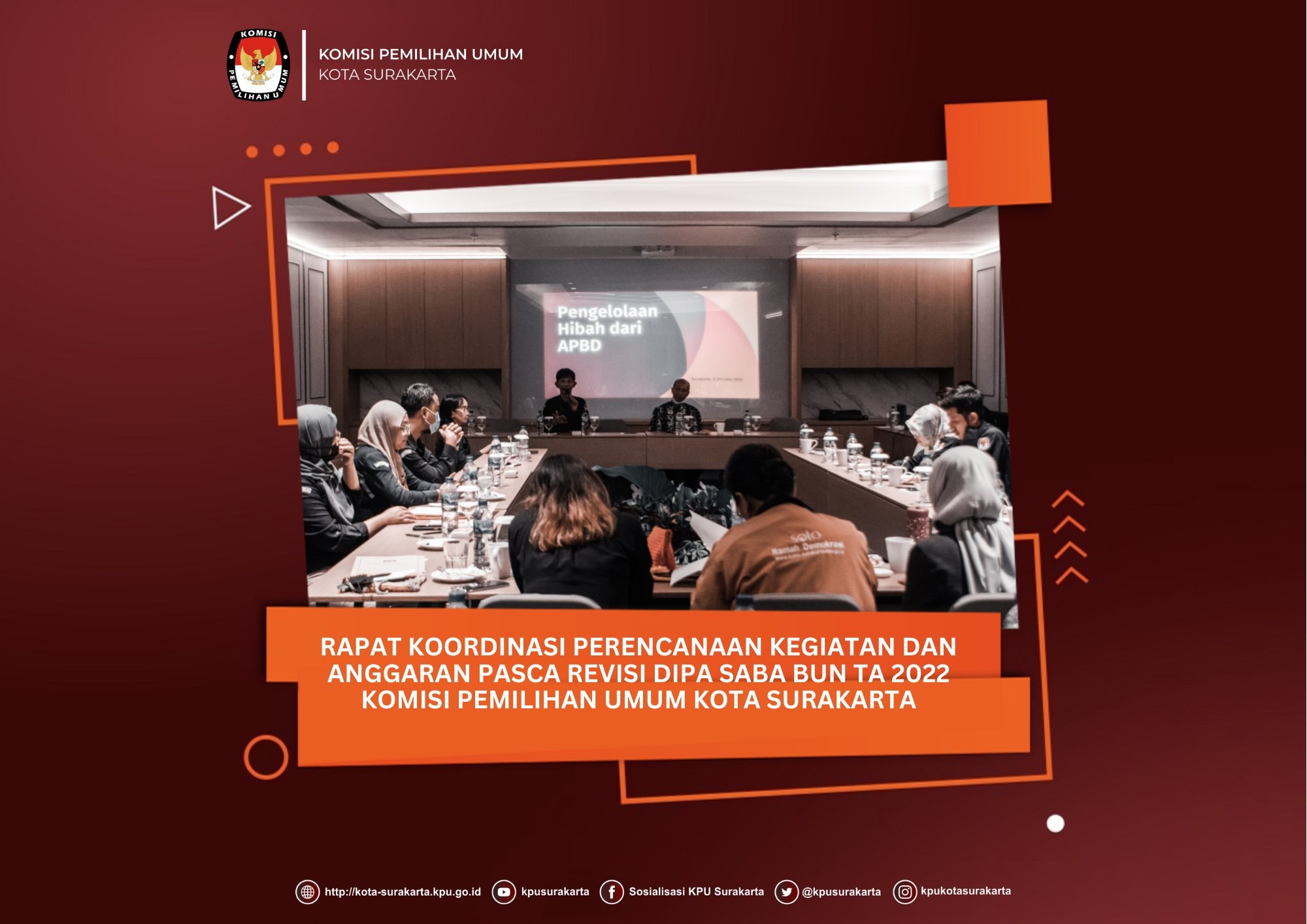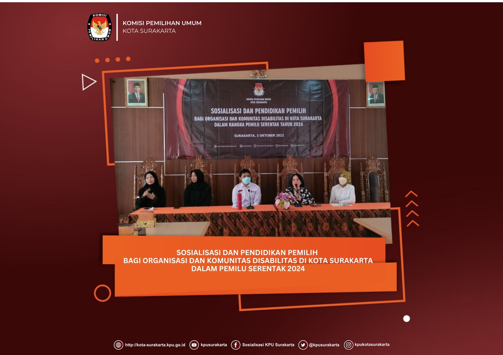 Senin, 3 Oktober 2022 Sosialisasi dan Pendidikan Pemilih bagi Organisasi dan Komunitas Disabilitas dalam Rangka Pemilu Serentak Tahun 2024 dilaksanakan di Aula KPU Kota Surakarta. Peserta dari kegiatan tersebut adalah dari Organisasi dan Komunitas Disabilitas di Kota Surakarta, Acara dibuka oleh Ketua KPU Kota Surakarta, Nurul Sutarti. Dalam sambutannya, beliau menyampaikan bahwa, Kegiatan ini ditujukan sebagai upaya Sosialisasi dan Penyebaran Informasi Penyelenggaraan Pemilu Serentak 2024 yang akan dilaksanakan pada Rabu 14 Februari 2022. Sosialisasi ditujukan bukan hanya untuk masyarakat umum yang telah memenuhi persyaratan sebagai Pemilih, namun juga menyasar pada Penyandang Disabilitas sesuai yang diamanatkan dalam Undang-undang.