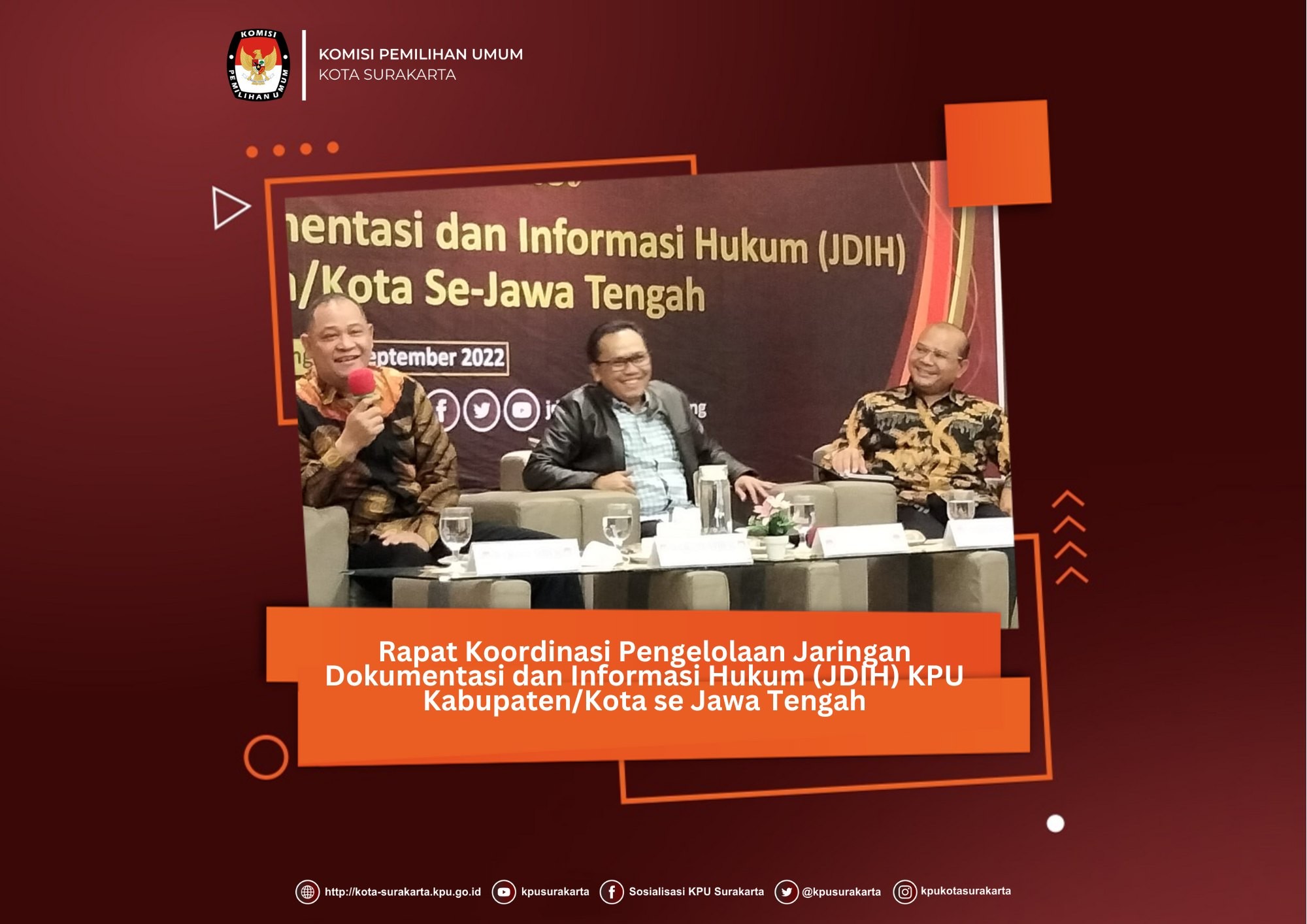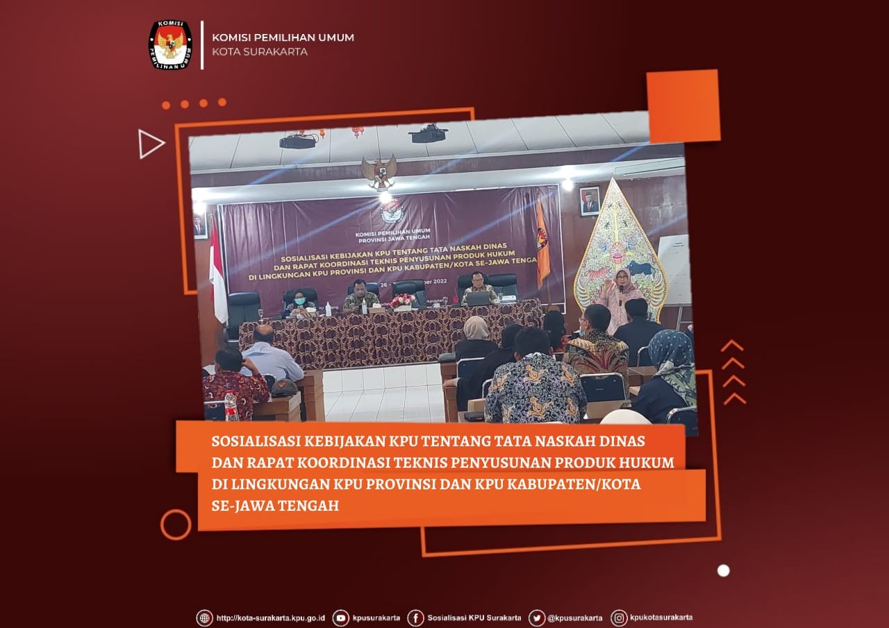 Anggota Divisi Hukum dan Pengawasan KPU Kota Surakarta, Puji Kusmarti, Kasubbag Hukum dan SDM, Arum Kismaharani, dan Staf Hukum dan SDM, Rachmad Panji Sidarto, pada 26 September 2022 mengikuti kegiatan Rapat Koordinasi Pengelolaan Jaringan Dokumentasi dan Informasi Hukum (JDIH). Kegiatan tersebut diselenggarakan oleh KPU Kota Semarang dan difasilitasi oleh KPU Provinsi Jawa Tengah.