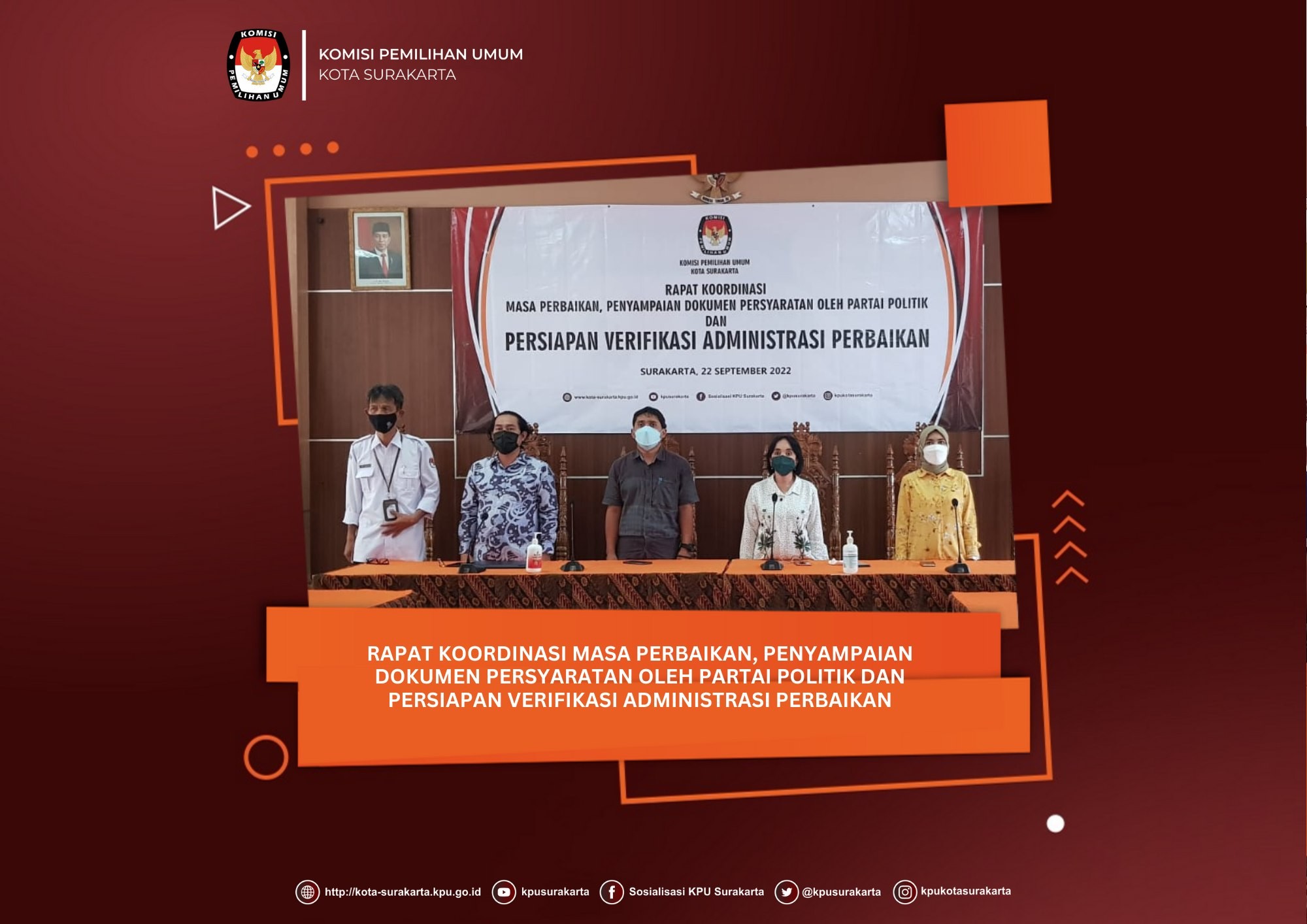 Sabtu, 17 September 2022 KPU Kota Surakarta mengikuti Rapat Koordinasi Evaluasi Verifikasi Administrasi dan Persiapan Verifikasi Administrasi Perbaikan Keanggotaan Partai Politik. Acara diikuti oleh KPU Kabupaten/kota se eks karesidenan Surakarta dan Kedu.