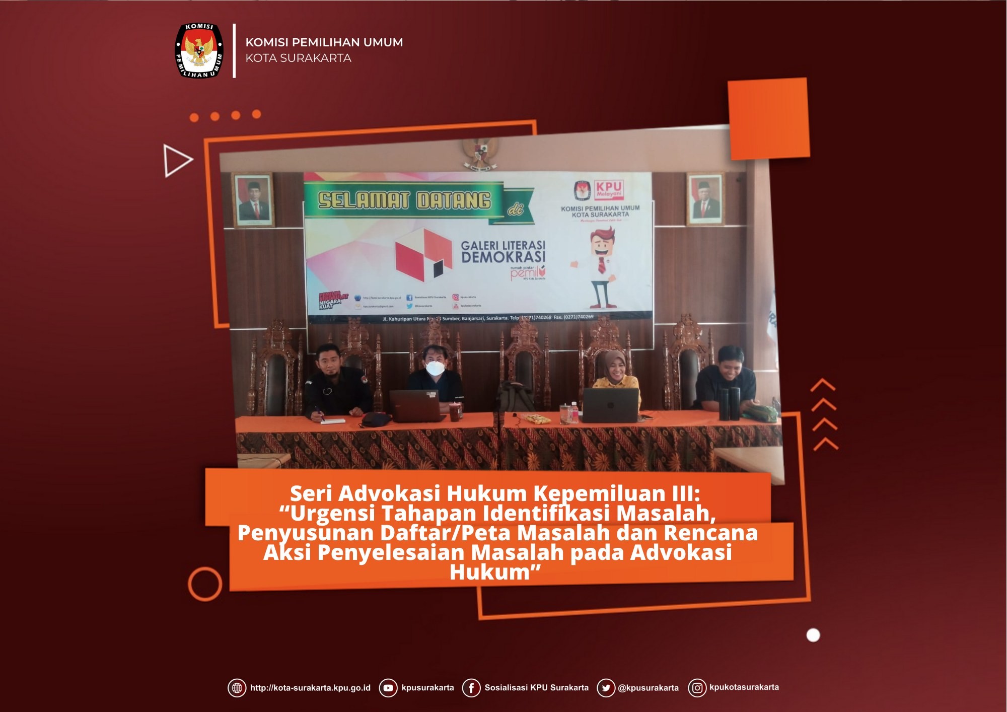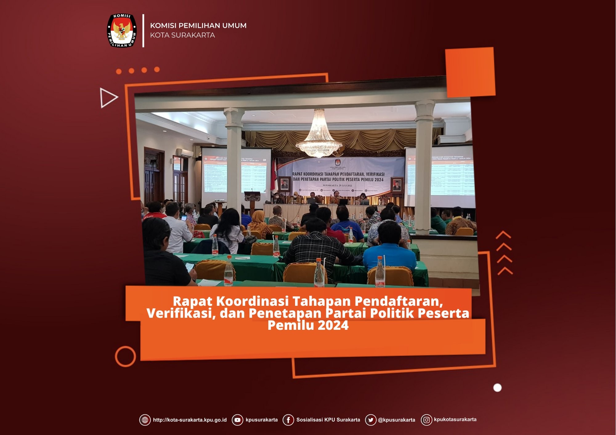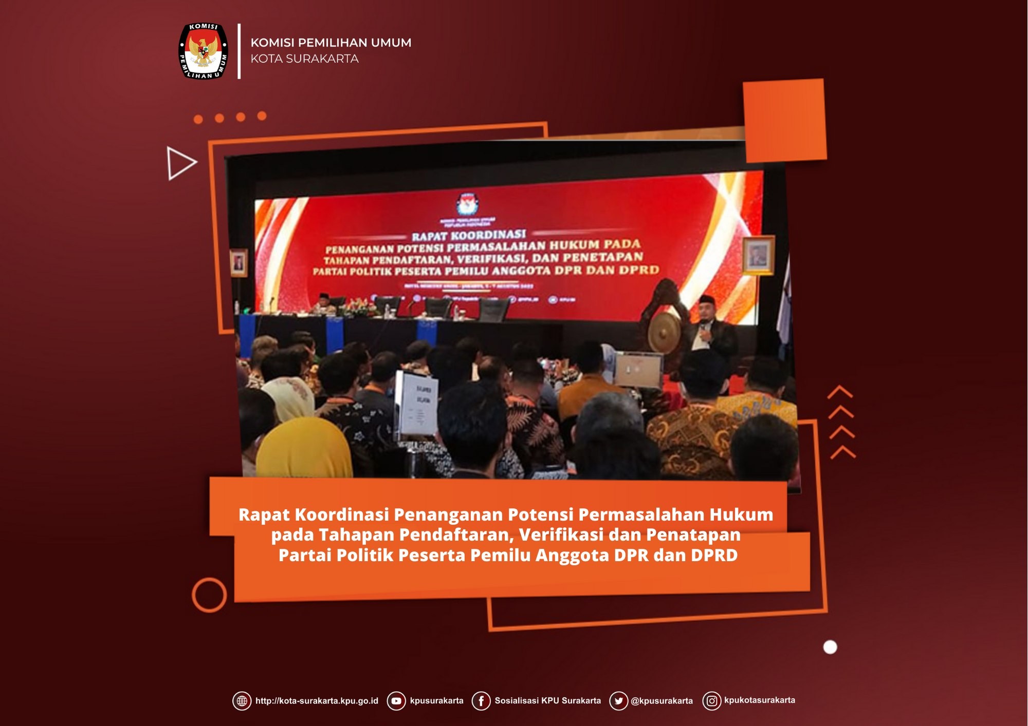 KPU RI pada 5-7 Agustus 2022 menggelar kegiatan Rapat Koordinasi Penanganan Potensi Permasalahan Hukum pada Tahapan Pendaftaran, Verifikasi dan Penatapan Partai Politik Peserta Pemilu Anggota DPR dan DPRD, bertempat di Hotel Mercure Covention Center Ancol, Jakarta. Kegiatan tersebut diikuti oleh 1.125 peserta terdiri Anggota Divisi hukum, Kepala Bagian dan Kepala Sub Bagian yang menangani Hukum dan Pengawasan Internal KPU Provinsi/KIP Aceh dan KPU/KIP Kab/Kota se-Indonesia. Adapun dari KPU Kota Surakarta sendiri, hadir Anggota KPU Kota Surakarta Divisi Hukum dan Pengawasan (Puji Kusmarti) dan Kepala Subbagian Hukum dan SDM (Arum Kismaharani) mengikuti kegiatan tersebut.