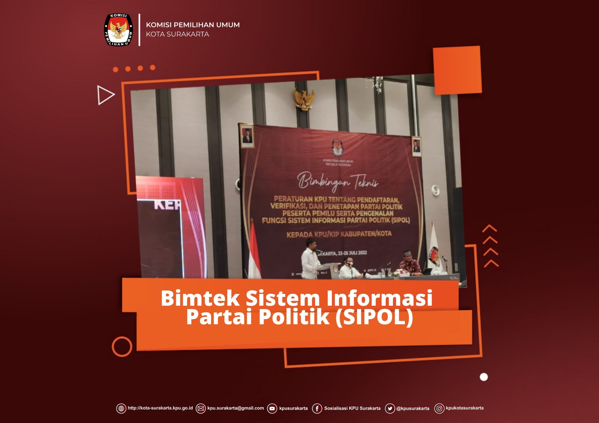 KPU Kota Surakarta menghadiri Bimtek Sistem Informasi Partai Politik (SIPOL) diselenggarakan oleh KPU RI tanggal 23-25 Juli 2022. Hadir dalam acara ini, dari KPU Kota Surakarta diantaranya : Suryo Baruno, selaku Divisi Teknis Penyelenggaraan, Kajad Pamuji Joko Waskito selaku Divisi Perencanaan, Data dan Informasi, Rois Alfianto selaku Kasubbag TP3HM, dan Wenda Priyanto selaku Operator Sipol KPU Kota Surakarta.