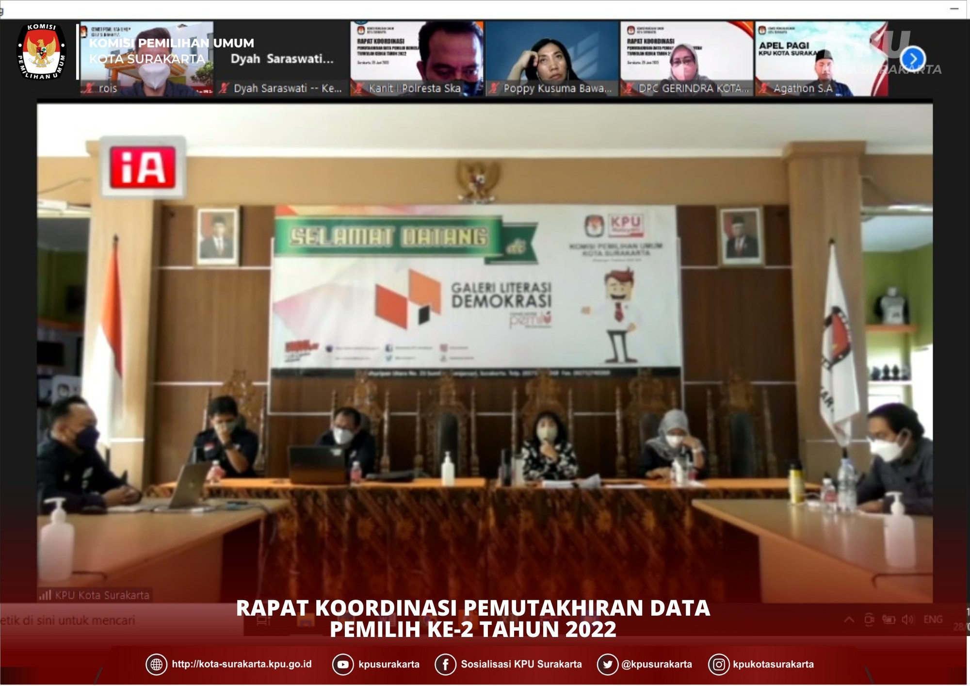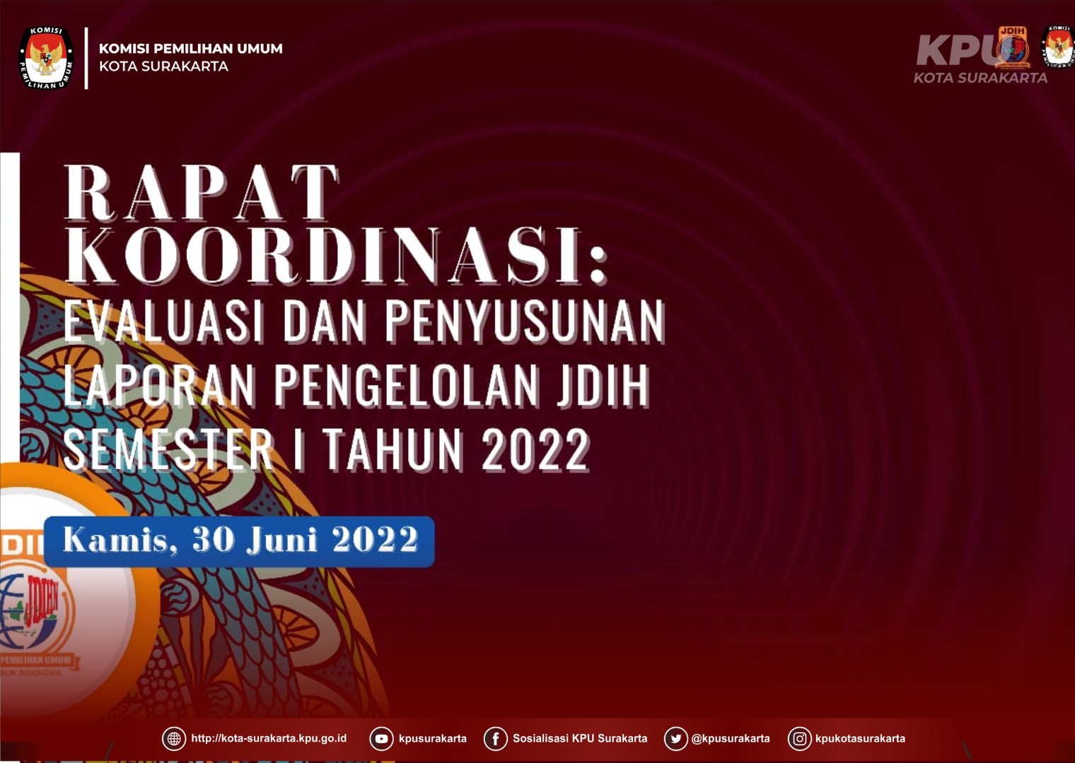 Kamis (30/6) Divisi Hukum dan Pengawasan, Puji Kusmarti, dan Kepala Sub Bagian Hukum dan SDM KPU Kota Surakarta, Arum Kismaharani, beserta Staf Pelaksana Pengelola JDI KPU Kota Surakarta menghadiri Rapat Koordinasi Evaluasi dan Penyusunan Laporan Pengelolaan JDIH Semester I Tahun 2022, yang diselengarakan KPU Provinsi Jawa Tengah. Kegiatan dilaksanakan secara daring melalui aplikasi zoom meeting.