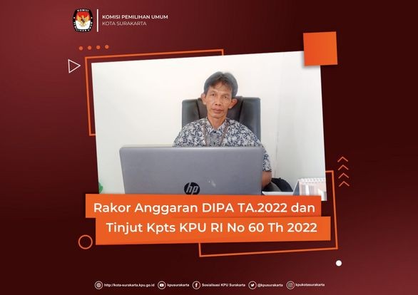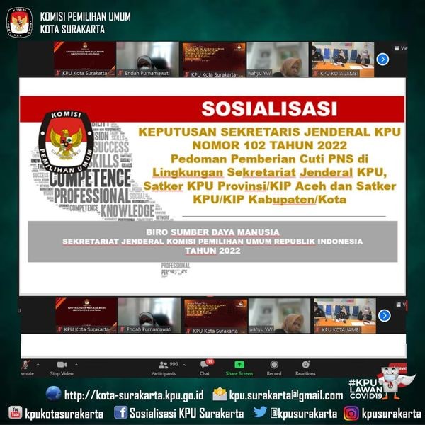 Sekretaris KPU Kota Surakarta, Tanto Winurdin dan Kasubbag Hukum dan SDM, Arum Kismaharani, mengikuti “Sosialisasi Petunjuk Teknis Tunjangan Kinerja dan Pedoman Cuti PNS di Lingkungan Sekretariat Jenderal KPU, Sekretariat KPU Provinsi/KIP Aceh dan Sekretariat KPU/KIP Kabupaten/Kota” yang diselenggarakan oleh Sekretariat Jenderal KPU RI (Rabu, 6/4/22).
