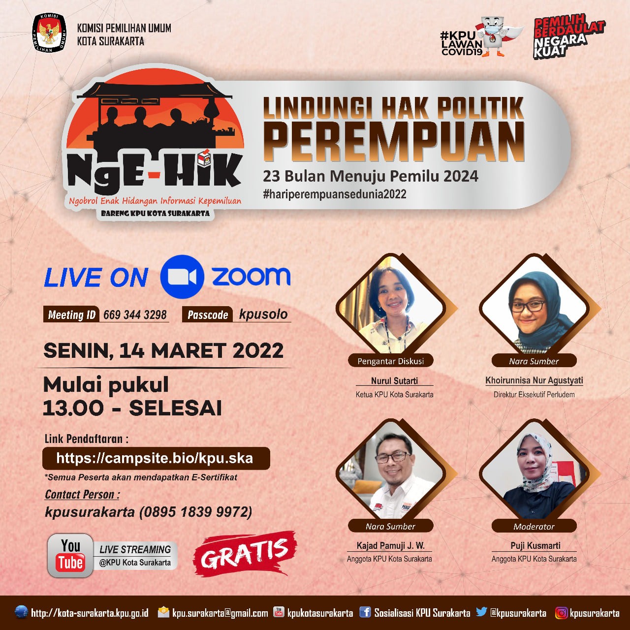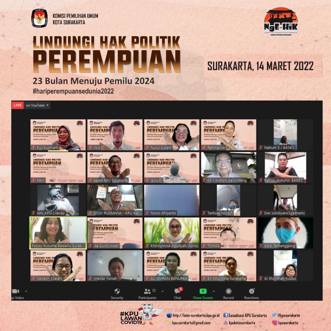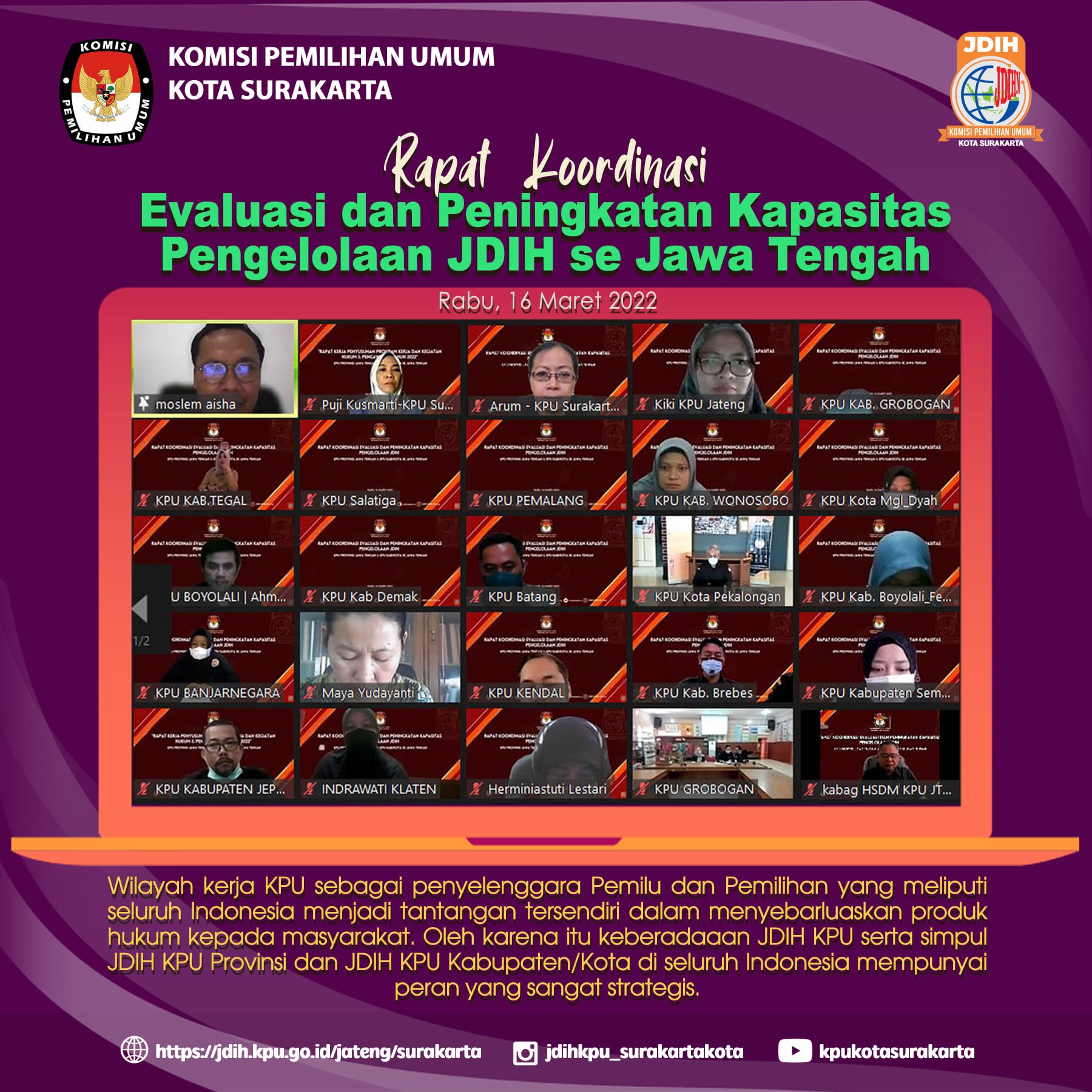Tim Pengelola JDIH KPU Kota Surakarta mengikuti Rapat Koordinasi Evaluasi dan Peningkatan Kapasitas Pengelolaan JDIH yang diselenggarakan oleh KPU Provinsi Jawa Tengah dan diikuti oleh 35 KPU Kabupaten/Kota se-Jawa Tengah secara daring pada Rabu, 16 Maret 2022. Tim Pengelola JDIH KPU Kota Surakarta yang hadir mengikuti rakor antara lain Puji Kusmarti (Divisi Hukum dan Pengawasan), Arum Kismaharani (Kasubbag Hukum dan SDM), Rachmat Panji Sidarto dan Oinike Sinaga (staf pelaksana Subbag Hukum dan SDM). Selain melakukan evaluasi atas kinerja JDIH selama bulan Januari-Februari 2022, KPU Provinsi Jawa Tengah juga mengajak KPU Kab/Kota untuk mengkaji Keputusan Komisi Pemilihan Umum Republik Indonesia Nomor 10/HK.04/08/2022 tentang Pedoman Teknis Pengelolaan Dokumentasi dan Informasi Hukum di Lingkungan Komisi Pemilihan Umum, Komisi Pemilihan Umum Provinsi dan Komisi Pemilihan Umum Kabupaten/Kota yang menjadi pedoman bagi KPU di setiap tingkatan dalam menyelenggarakan pengelolaan JDIH. Pada bagian lain juga dibahas mengenai pemanfaatan media sosial dalam mendukung penyelenggaraan JDIH. Pengelolaan konten melalui medsos merupakan bagian terpadu dari kegiatan penyampaian informasi hukum kepada masyarakat, oleh karena itu pengelolaan harus dilakukan dengan baik dan terarah. Informasi terkait kebijakan KPU yang telah di unggah pada laman JDIH KPU disajikan ke dalam bentuk lain yang lebih menarik dan mudah dipahami, sebab masyarakat memiliki kemampuan yang tidak sama dalam memahami suatu kebijakan yang telah ditetapkan oleh KPU. Hal ini yang harus dapat diterjemahkan dalam bentuk konten yang sederhana dan menarik masyarakat melalui media sosial. Wilayah kerja KPU sebagai penyelenggara Pemilu dan Pemilihan yang meliputi seluruh Indonesia menjadi tantangan tersendiri dalam menyebarluaskan produk hukum kepada masyarakat. Oleh karena itu keberadaaan JDIH KPU serta simpul JDIH KPU Provinsi dan JDIH KPU Kabupaten/Kota di seluruh Indonesia mempunyai peran yang sangat strategis. Sebagai sebuah simpul JDIH KPU, maka berdasarkan Perpres Nomor 33 Tahun 2012 tentang Jaringan Dokumentasi dan Informasi Hukum Nasional, KPU disemua tingkatan harus mengelola JDIH dan menyediakan elemen pendukung, sarana dan prasarana, sumber daya manusia, standar operasional prosedur, dan anggaran yang mampu mendukung pengelolaan JDIH KPU yang berkualitas, sebagai bagian dari Jaringan Dokumentasi dan Informasi Hukum Nasional, mengingat pula bahwa target Pusat JDIHN di tahun 2022 ini adalah pemetaan dan validasi data dokumen hukum yang terintegrasi. Pada akhirnya, yang paling penting adalah bahwa keberadaan JDIH mampu memberikan layanan informasi hukum secara lengkap, akurat, mudah dan cepat sehingga bermanfaat bagi masyarakat luas. #kpukotasurakarta #jdihkpu #jdihkpukotasurakarta #jdihn #pemiluserentak2024 #kpumelayani