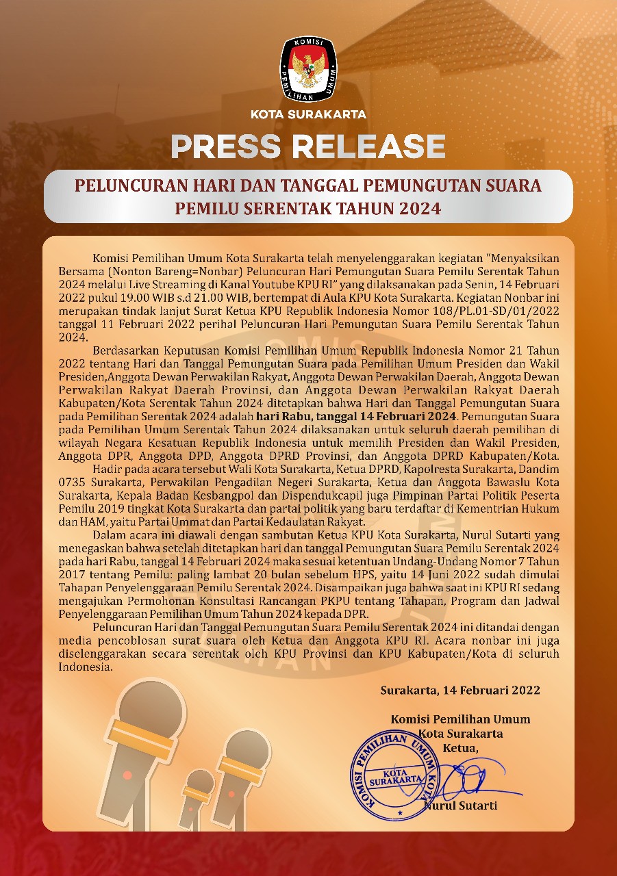 Pada kesempatan tersebut Ketua KPU Kota Surakarta, Nurul Sutarti menyampaikan bahwa terkait dengan pemekaran wilayah kelurahan di Kota Surakarta akan berdampak pada tahapan Pemilu/Pemilihan Serentak 2024 mendatang. Beberapa tahapan yang dimungkinkan akan terpengaruh apabila pemekaran tersebut terealisasi diantaranya tahapan penataan dapil, verifikasi faktual parpol, pemutakhiran data pemilih, dan pembentukan TPS.
