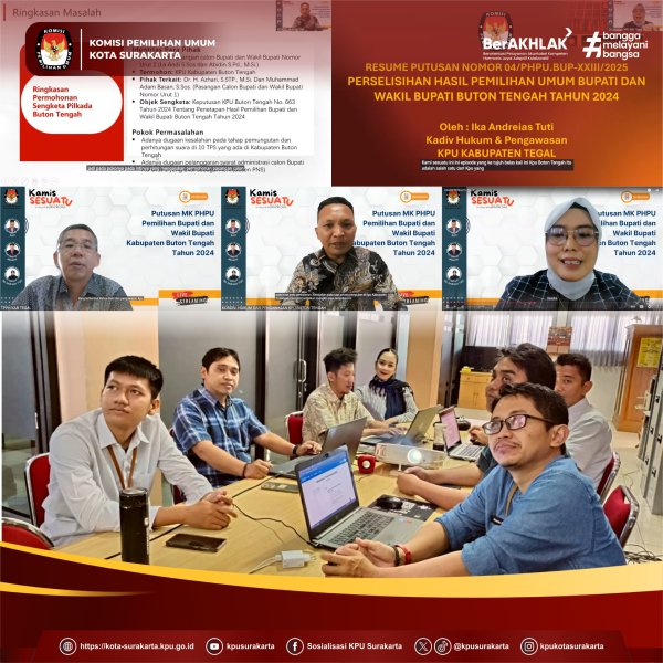 Surakarta, kota-surakarta.kpu.go.id - KPU Kota Surakarta mengikuti Kegiatan yang diselenggarakan oleh Komisi Pemilihan Umum (KPU) Provinsi Jawa Tengah yaitu Kajian Rutin “Kamis Sesuatu” seri ke-XVII Divisi Hukum dan Pengawasan Tahun 2025 di lingkungan KPU Provinsi dan KPU Kabupaten/Kota Se Jawa Tengah, di ruang Komisioner KPU Kota Surakarta, Kamis (4/9/2025).