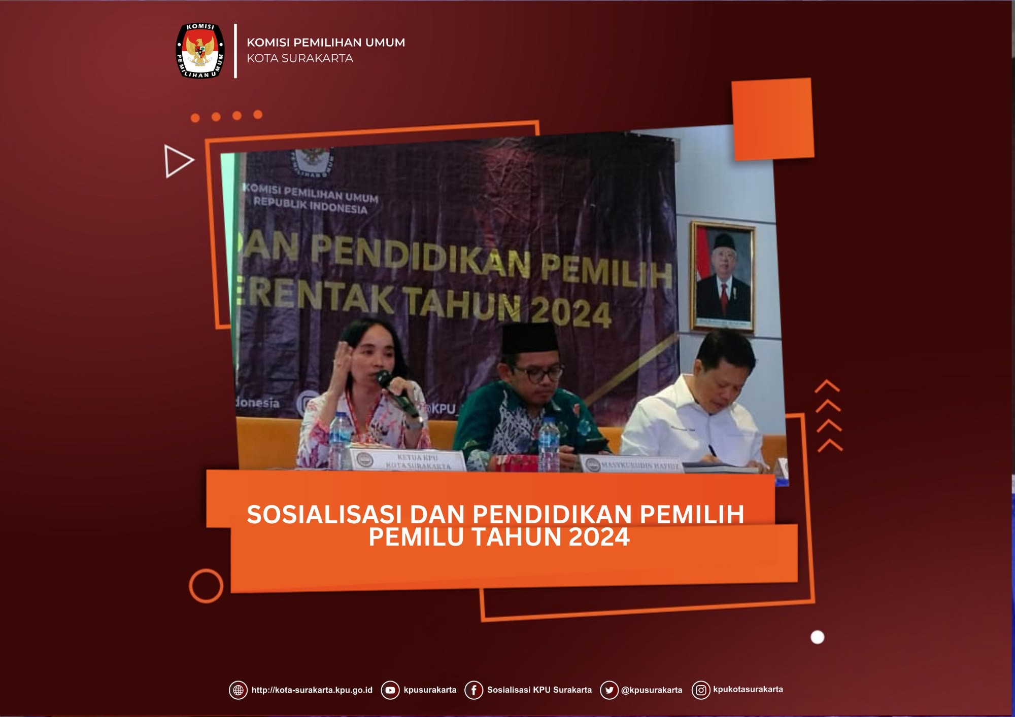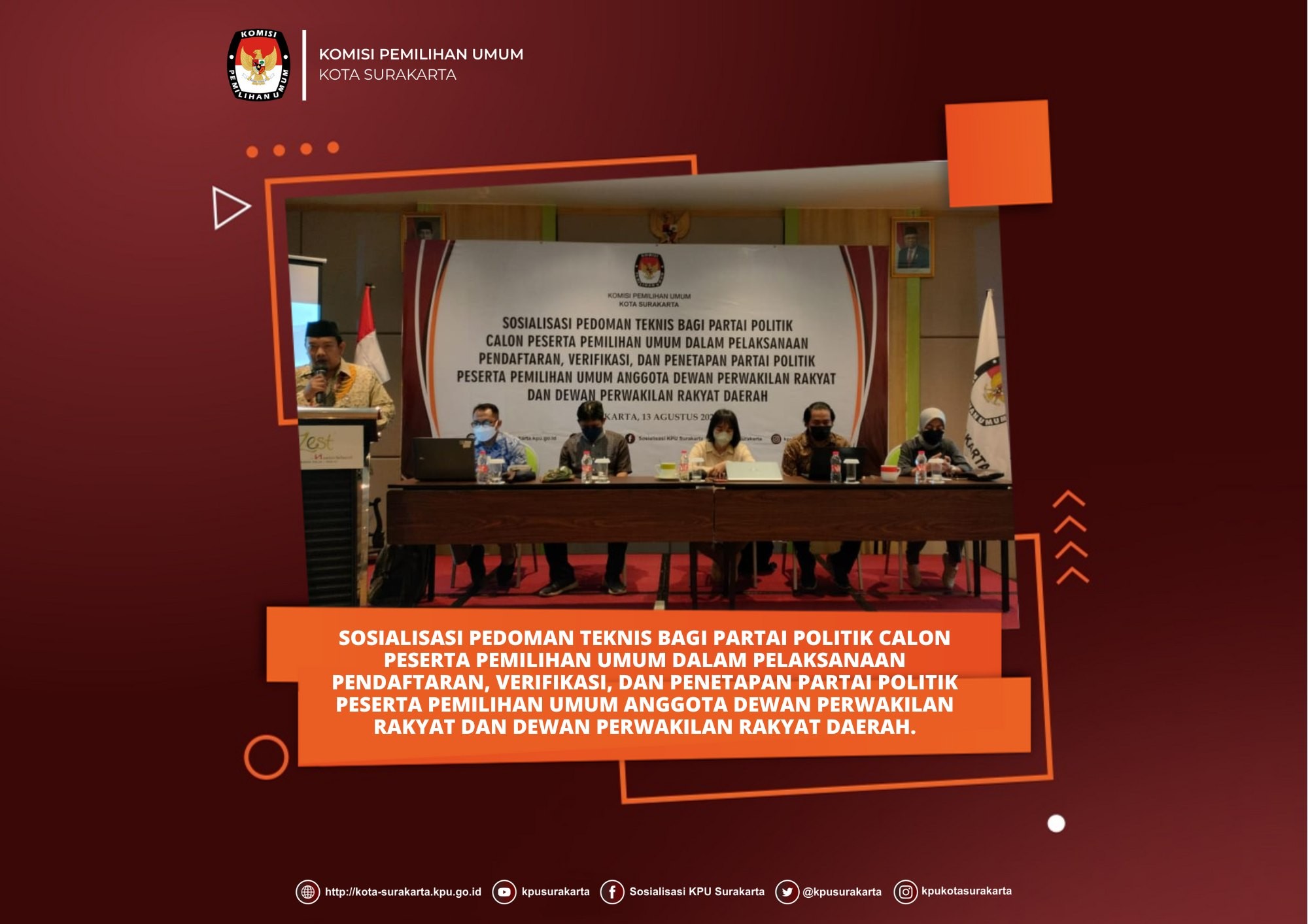 Solo (13/08) KPU Kota Surakarta menyelenggarakan Sosialisasi Pedoman Teknis bagi Partai Politik Calon Peserta Pemilihan Umum Dalam Pelaksanaan Pendaftaran, Verifikasi, Dan Penetapan Partai Politik Peserta Pemilihan Umum Anggota DPR dan DPRD. Hadir pula pada kegiatan ini Ketua dan Anggota Bawaslu Kota Surakarta. Kegiatan ini diikuti oleh perwakilan kepengurusan Partai Politik di tingkat Kota Surakarta. Kegiatan dibuka oleh Ketua KPU Kota Surakarta, Nurul Sutarti, SP., M.Si. Dalam sambutannya, Nurul menyampaikan hingga saat ini ada 21 Parpol yang telah diterima pendaftarannya oleh KPU RI dan ada 9 Parpol yang dikembalikan dan ditunggu perbaikan kelengkapan pendaftarannya hingga tanggal 14 Agustus 2022. Nurul menambahkan tujuan dari sosialisasi ini sehubungan dengan telah diterbitkannya Keputusan KPU RI Nomor 259 Tahun 2022 tentang Pedoman Teknis Bagi Partai Politik Calon Peserta Pemilihan Umum Dalam Pelaksanaan Pendaftaran, Verifikasi, dan Penetapan Partai Politik Peserta Pemilihan Umum Anggota Dewan Perwakilan Rakyat dan Dewan Perwakilan Rakyat Daerah. Selanjutnya, pemaparan materi oleh Ketua Divisi Teknis Penyelenggaraan Pemilu, Suryo Baruno, S.Pt., MM. Suryo menyampaikan materi terkait jadwal tahapan Pendaftaran, Verifikasi, dan Penetapan Partai Politik Peserta Pemilihan Umum kemudian dilanjutkan terkait proses verifikasi administrasi dan faktual. Kemudian, Suryo menyampaikan materi terkait Pedoman Teknis Bagi Partai Politik Calon Peserta Pemilihan Umum Dalam Pelaksanaan Pendaftaran, Verifikasi, dan Penetapan Partai Politik Peserta Pemilihan Umum Anggota Dewan Perwakilan Rakyat dan Dewan Perwakilan Rakyat Daerah sebagaimana tertuang dalam Keputusan KPU RI Nomor 259 Tahun 2022. Acara diakhiri dengan diskusi dan tanya jawab oleh para peserta. Salah satu Perwakilan Partai menyampaikan pertanyaan terkait mekanisme cara pencuplikan sampel beserta jumlah keanggotaan yang akan dilakukan verifikasi faktual. Selain itu mempertanyakan bagaimana dengan kondisi prokes di era pandemi seperti sekarang ini apabila Parpol harus menghadirkan anggota yang belum dapat ditemui pada saat verifikasi faktual. Pada akhir kegiatan, Suryo Baruno menyampaikan menyampaikan bahwa Partai Politik di tingkat Kota Surakarta dapat memanfaatkan helpdesk KPU Kota Surakarta terkait fasilitasi dan konsultasi pelaksanaan tahapan pendaftaran, verifikasi, dan penetapan Parpol peserta Pemilu 2024 apabila memiliki beberapa pertanyaan maupun kendala. #kpumelayani #pemiluserentak2024 #kpusurakarta