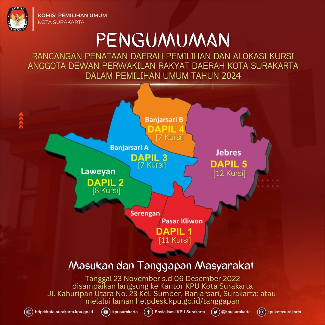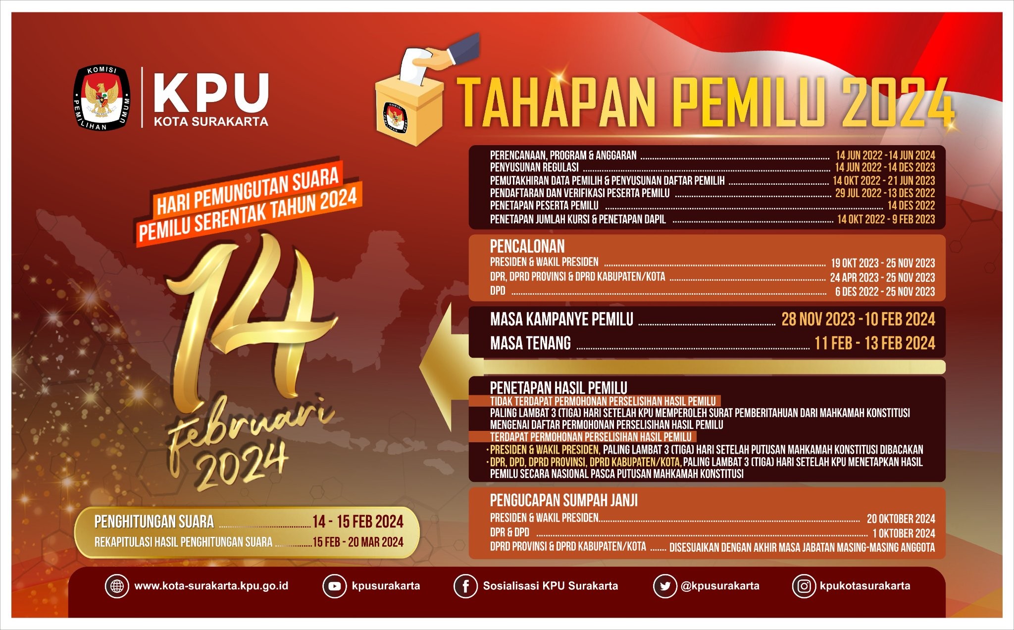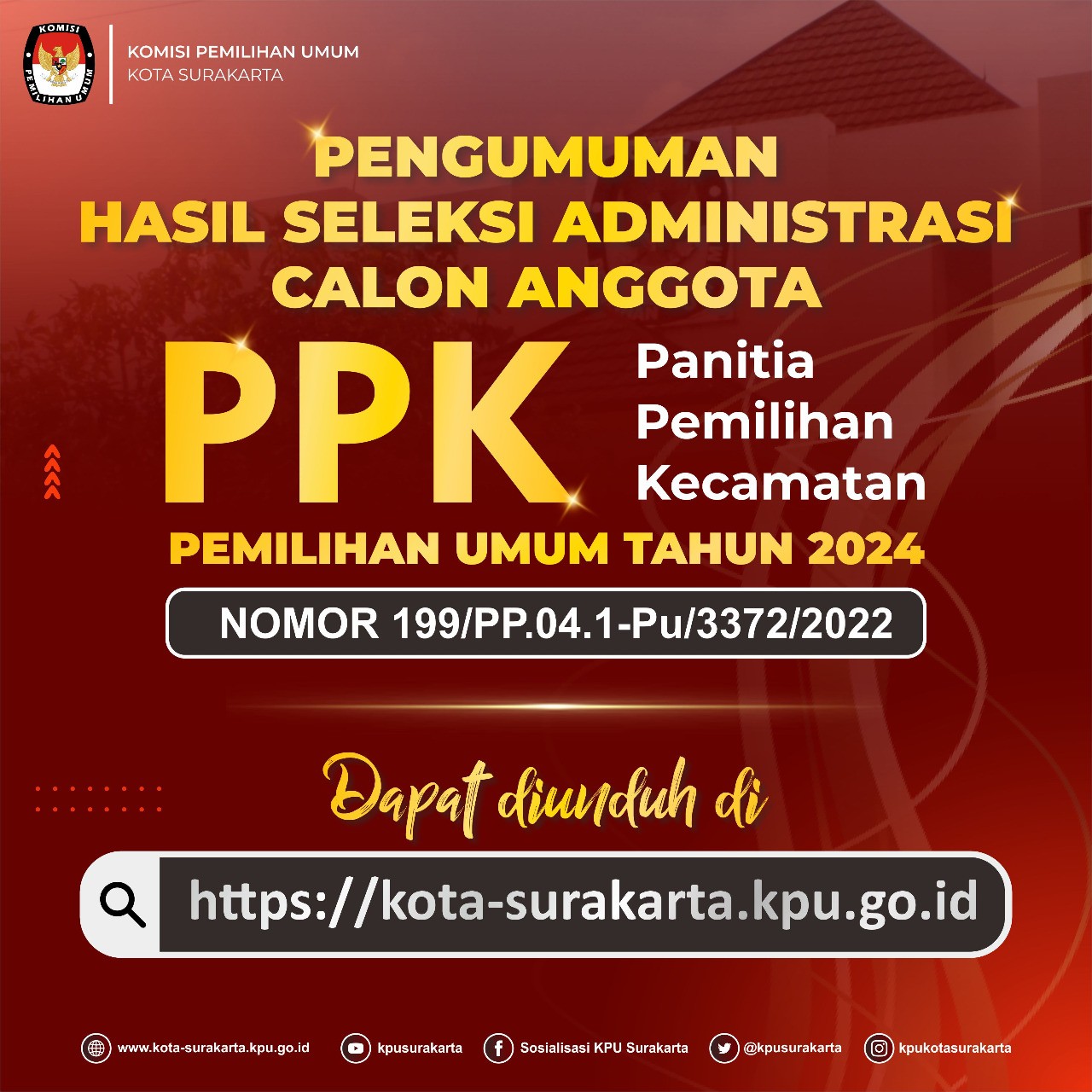 Berdasarkan Pengumuman KPU Kota Surakarta Nomor 199/PP.04.1-Pu/3372/2022 tanggal 2 Desember 2022 tentang Hasil Seleksi Administrasi Calon Anggota Panitia Pemilihan Kecamatan untuk Pemilihan Umum Tahun 2024, bersama ini disampaikan jadwal waktu dan tempat pelaksanaan, serta pembagian gelombang dan kelas Tes Tertulis dengan metode Computer Assisted Test (CAT) bagi para pendaftar yang dinyatakan Memenuhi Syarat,