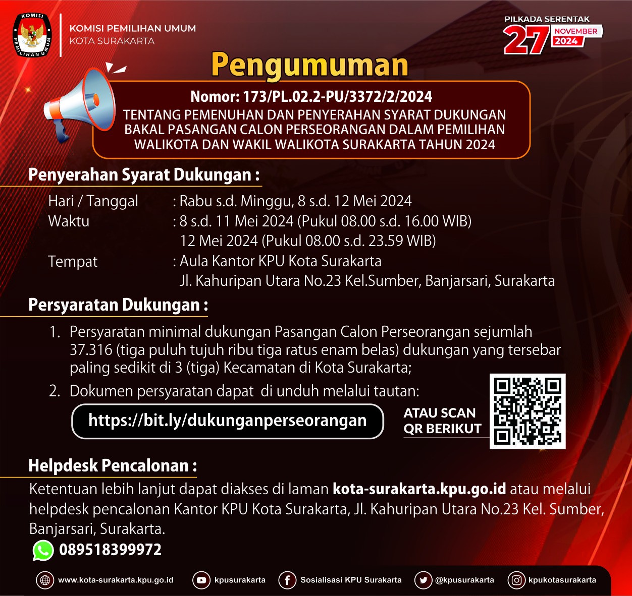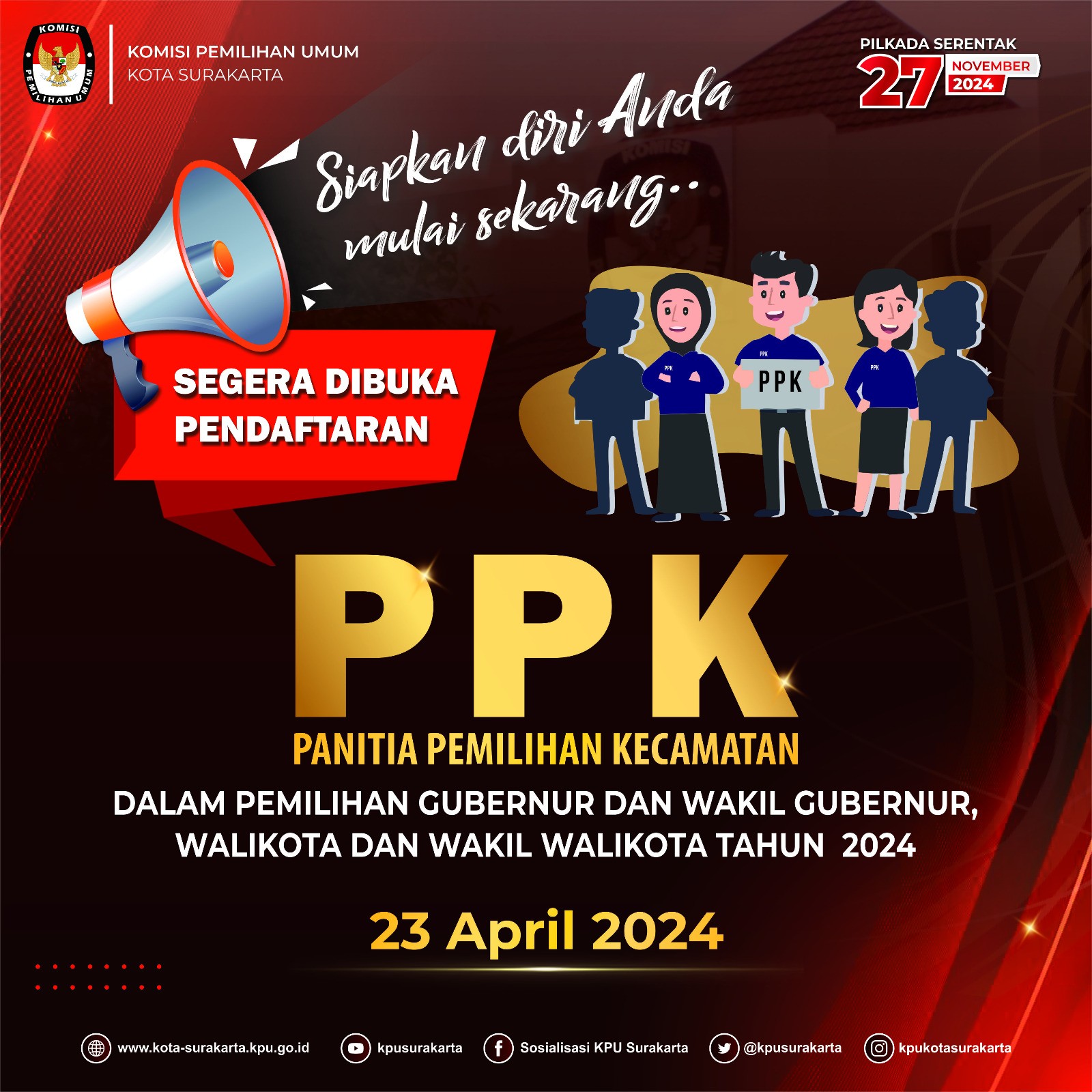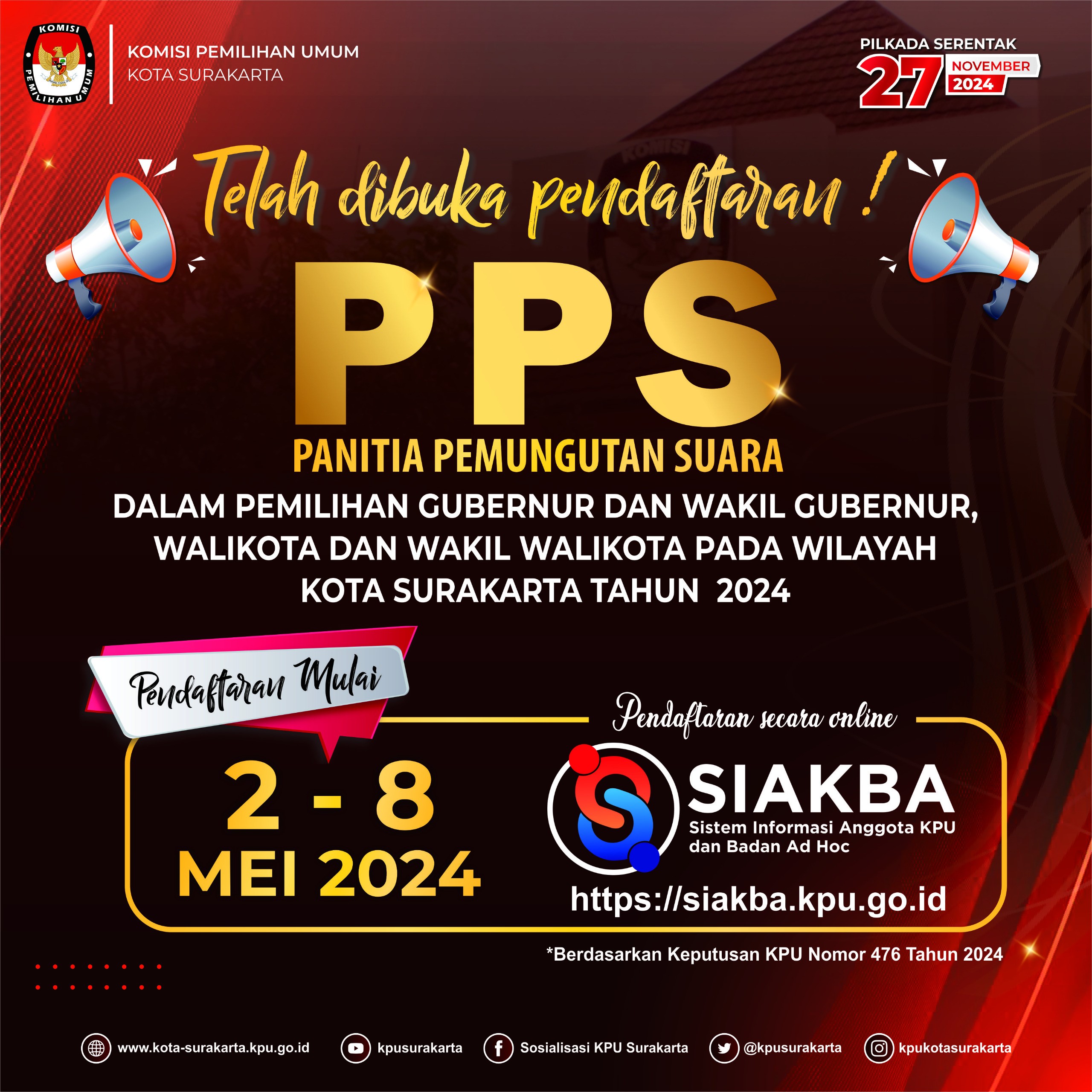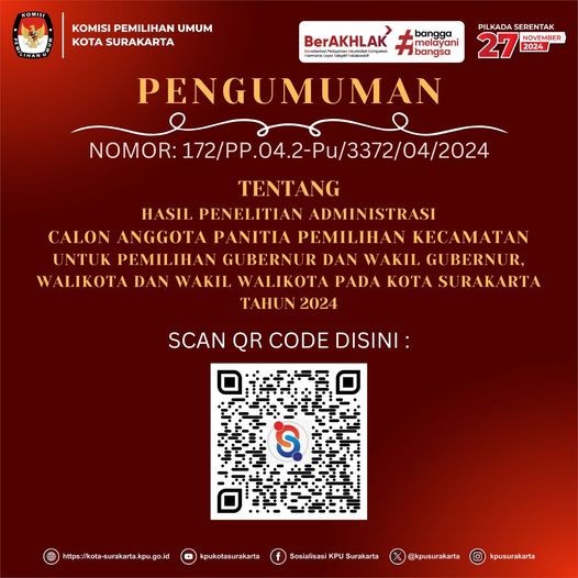 Sehubungan dengan Komisi Pemilihan Umum Kota Surakarta telah melaksanakan tahapan Seleksi Tertulis Calon Anggota Panitia Pemilihan Kecamatan untuk Pemilihan Gubernur dan Wakil Gubernur Jawa Tengah dan Walikota dan Wakil Walikota Tahun 2024, disampaikan beberapa hal sebagai berikut :