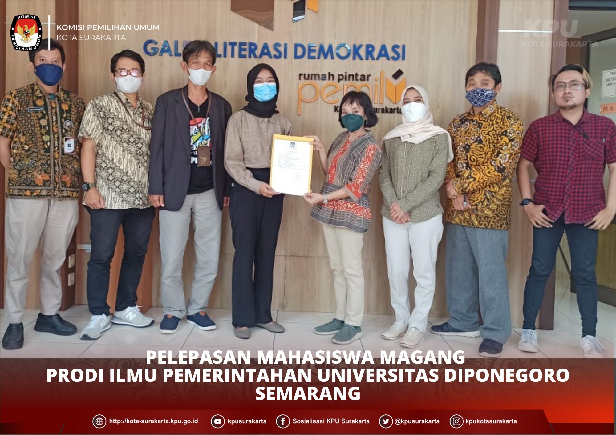KPU Kota Surakarta kembali melepas mahasiswa magang dari Program Studi Ilmu Pemerintahan, Fakultas Ilmu Sosial dan Ilmu Politik, Universitas Diponegoro Semarang. Bertempat di Aula KPU Kota Surakarta, Ucapan terima kasih dan apresiasi yang tinggi disampaikan oleh Ketua KPU Kota Surakarta, Nurul Sutarti, SP., M.Si. Beliau menyampaikan pesan, sudah saatnya anak muda ikut berperan dalam penyelenggaraan Pemilu/Pemilihan dan menjadi bagian dari sejarah demokrasi.