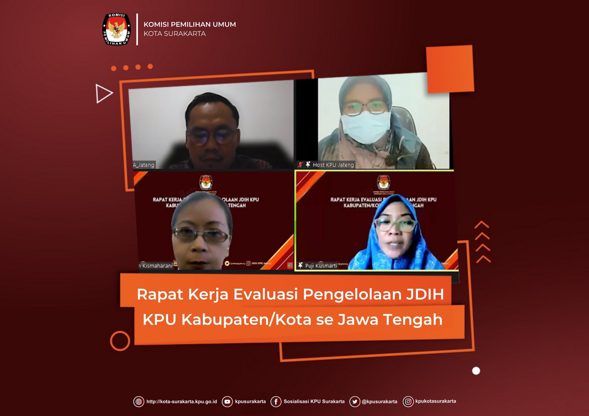 Pada Rabu, 13 April 2022, Divisi Hukum & Pengawasan (Puji Kusmarti) dan Kasubbag Hukum & SDM (Arum Kismaharani) KPU Kota Surakarta mengikuti kegiatan Rapat Kerja Evaluasi Pengelolaan JDIH KPU Kabupaten/Kota se Jawa Tengah yang diselenggarakan oleh KPU Provinsi Jawa Tengah secara daring via zoom meeting.