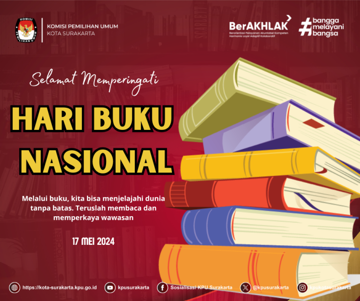 KPU Kota Surakarta Mengucapkan Selamat Memperingati Hari Buku Nasional. . Melalui buku, kita bisa Menjelajahi dunia tanpa batas. Teruslah membaca dan memperkaya Wawasan.