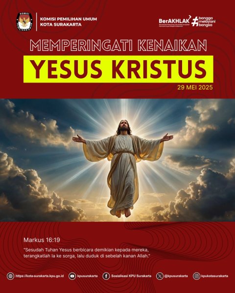 Segenap Keluarga besar KPU Kota Surakarta mengucapkan selamat memperingati Hari Kenaikan Yesus Kristus Tahun 2025 bagi temanpemilih yang merayakan... Semoga Tuhan selalu memberkati dan damai , kasih serta pengharapan senantiasa menyertai kita semua