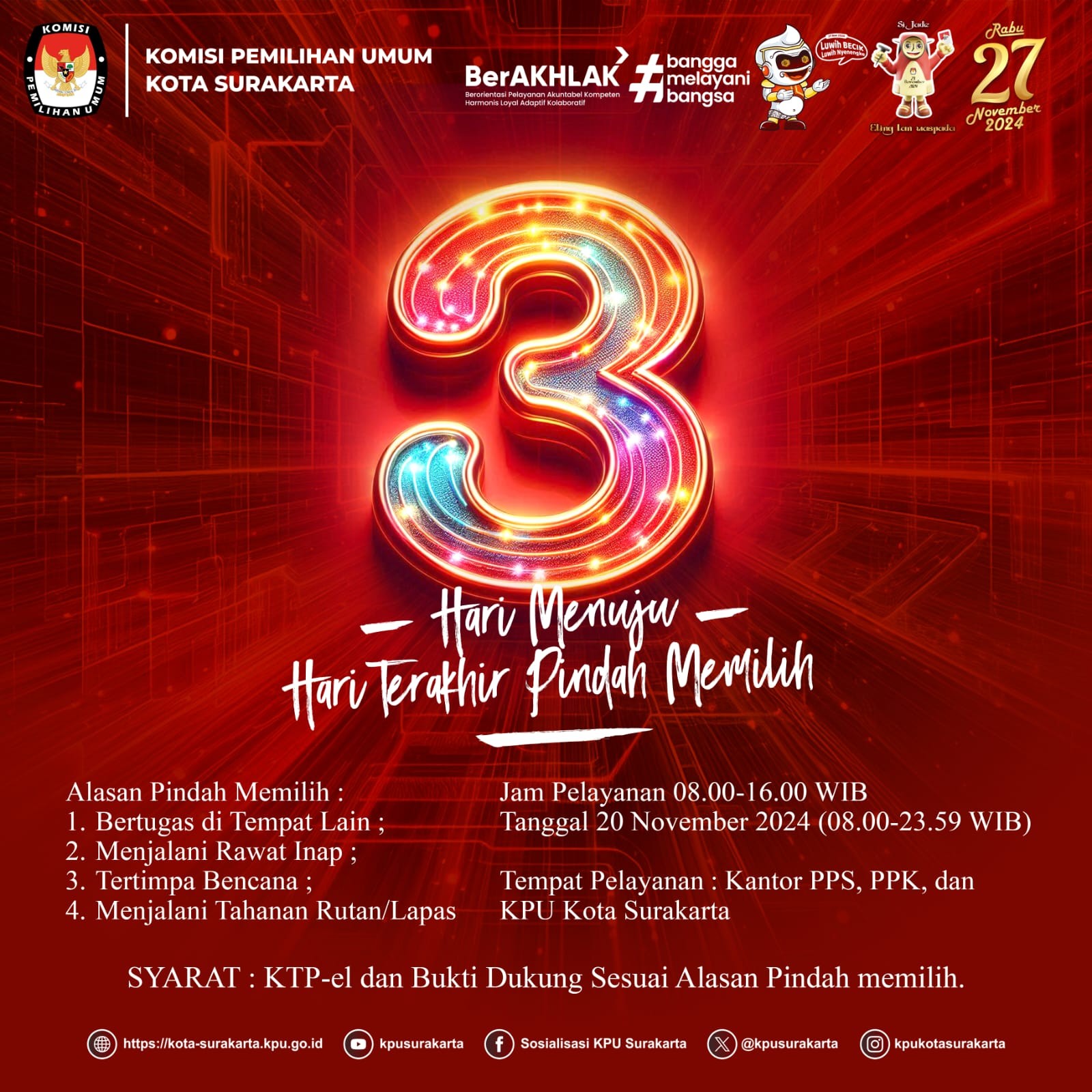 Surakarta, kota-surakarta.kpu.go.id – 3 Hari Menuju Hari Terakhir Pelayanan Pindah Memilih pada h-7 sebelum hari pemungutan suara padaPemilihan Gubernur dan Wakil Gubernur Jawa Tengah dan Pemilihan Walikota dan Wakil Walikota Surakarta Tahun 2024. (Ed:Asa/kpusurakarta)