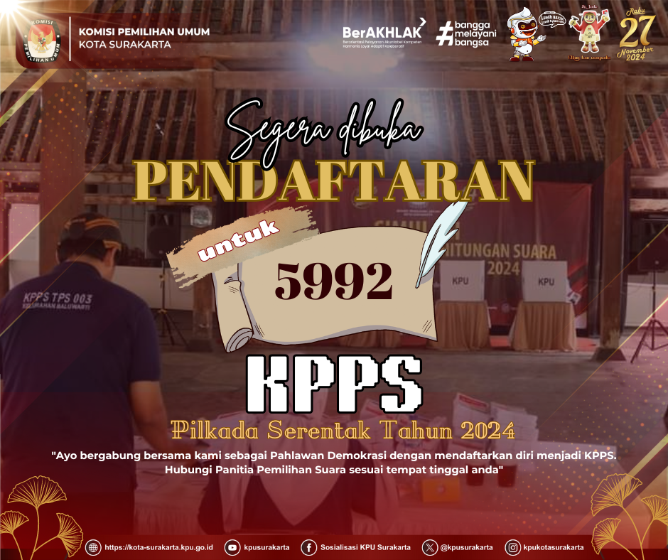 Surakarta, kota-surakarta.kpu.go.id - Komisi Pemilihan Umum (KPU) Kota Surakarta akan segera membuka pendaftaran Kelompok Penyelenggara Pemungutan Suara (KPPS) untuk Pilkada Serentak Tahun 2024 sebanyak 5992 yang tersebar untuk 856 TPS di Kota Surakarta. (Ed:Asa/kpusurakarta)