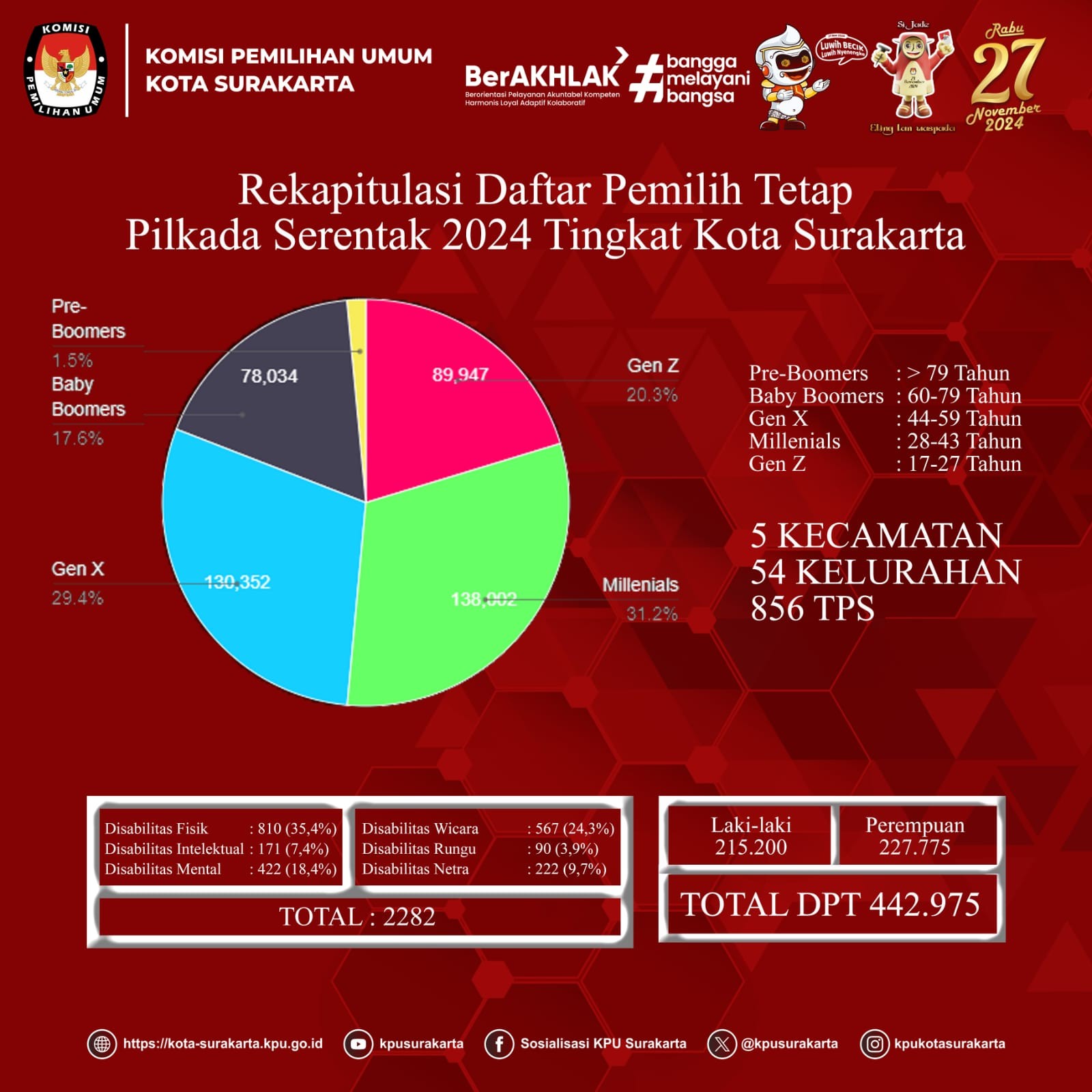 Surakarta, kota-surakarta.kpu.go.id - Berikut Infografis Rekapitulasi Daftar Pemilih Sementara (DPS) Tingkat Kota Surakarta. Berdasarkan Rentang Usia, Pemilih Disabilitas dan Keseluruhan Pemilih Dalam Pilwalkot Surakarta 2024.
