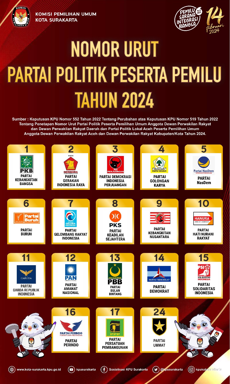 Partai Politik Peserta Pemilu Informasi Partai Politik Peserta Pemilu 2024 (Klik Di Sini) Share this artikel : Dilihat 357 Kali.